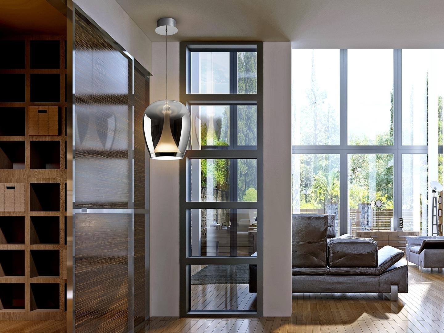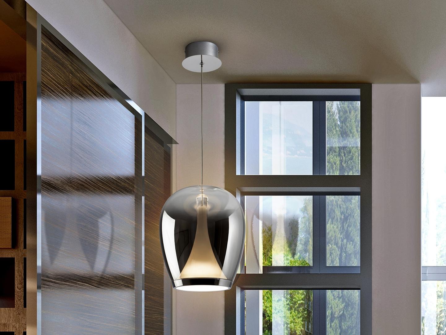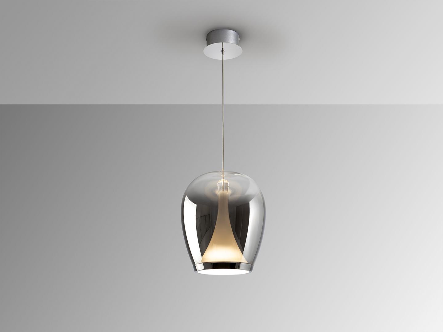 Лампа из хромированного алюминия с абажуром из выдувного стекла с градиентной дымчатой отделкой и опаловым внутренним рассеивателем. Регулируется по высоте. Светодиод 20 Вт, 1200 лм, 3000 К. · В комплект поставки этой лампы входят ГРАВИТАЦИОННЫЕ ЗАЖИМЫ для более надёжной фиксации на потолке.