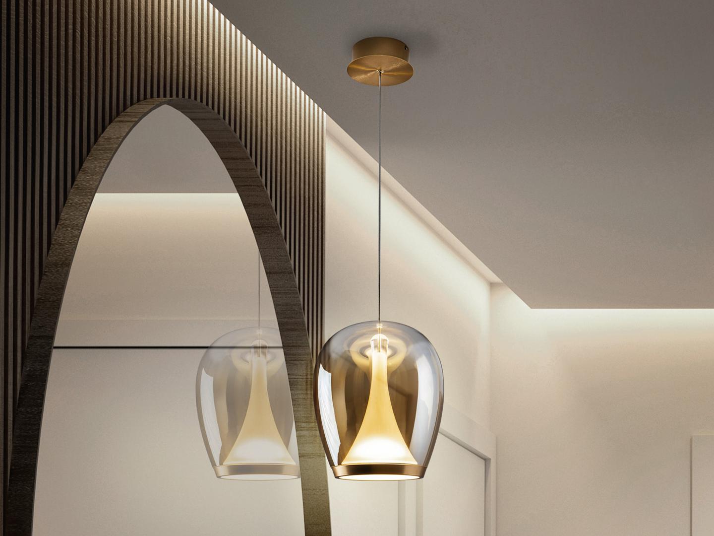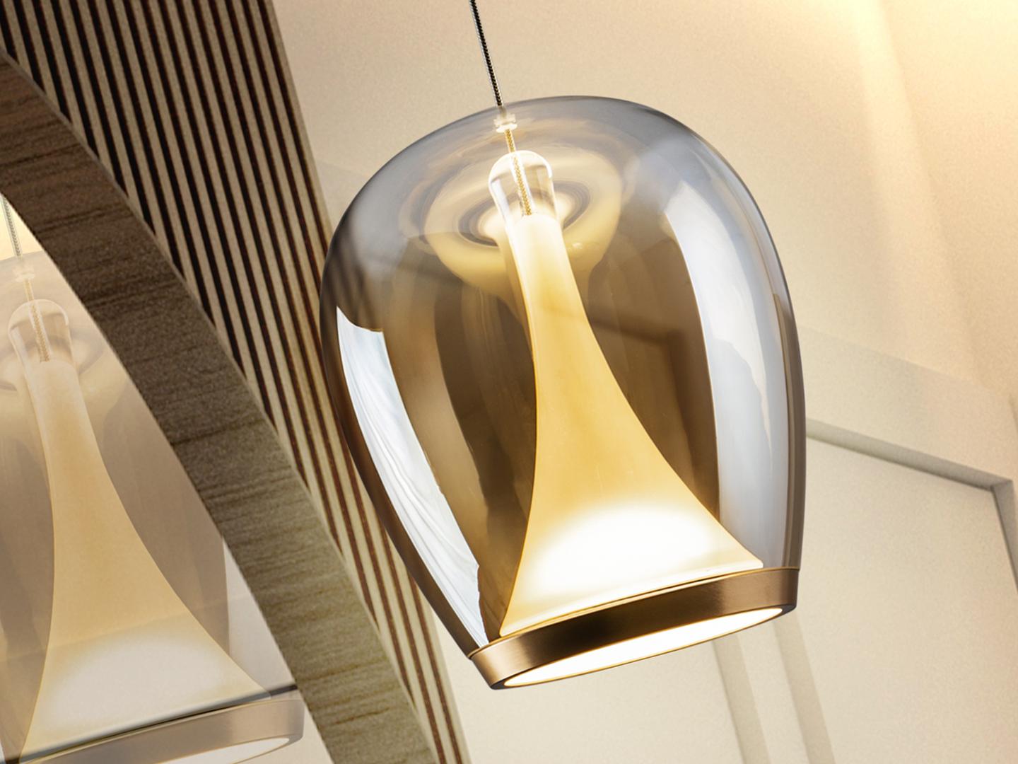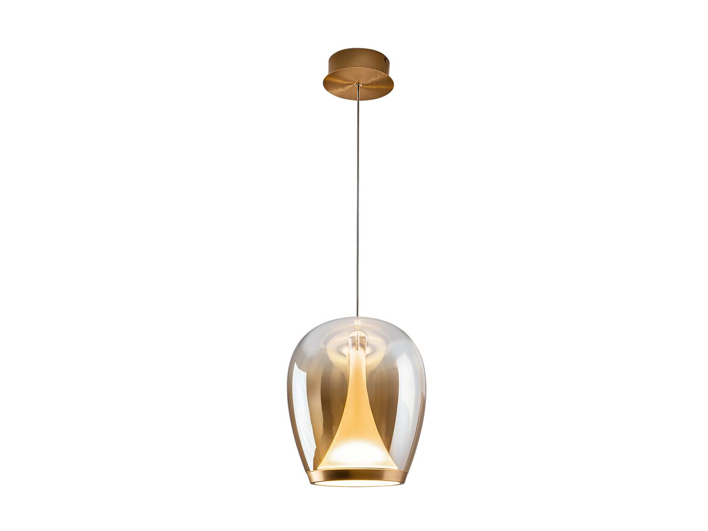 Лампа из анодированного золотистого алюминия с абажуром из выдувного стекла с градиентной янтарной отделкой и опаловым внутренним рассеивателем. Регулируется по высоте. Светодиод 20 Вт, 1200 лм, 3000 К. · В комплект поставки этой лампы входят ГРАВИТАЦИОННЫЕ ЗАЖИМЫ для более надёжной фиксации на потолке.