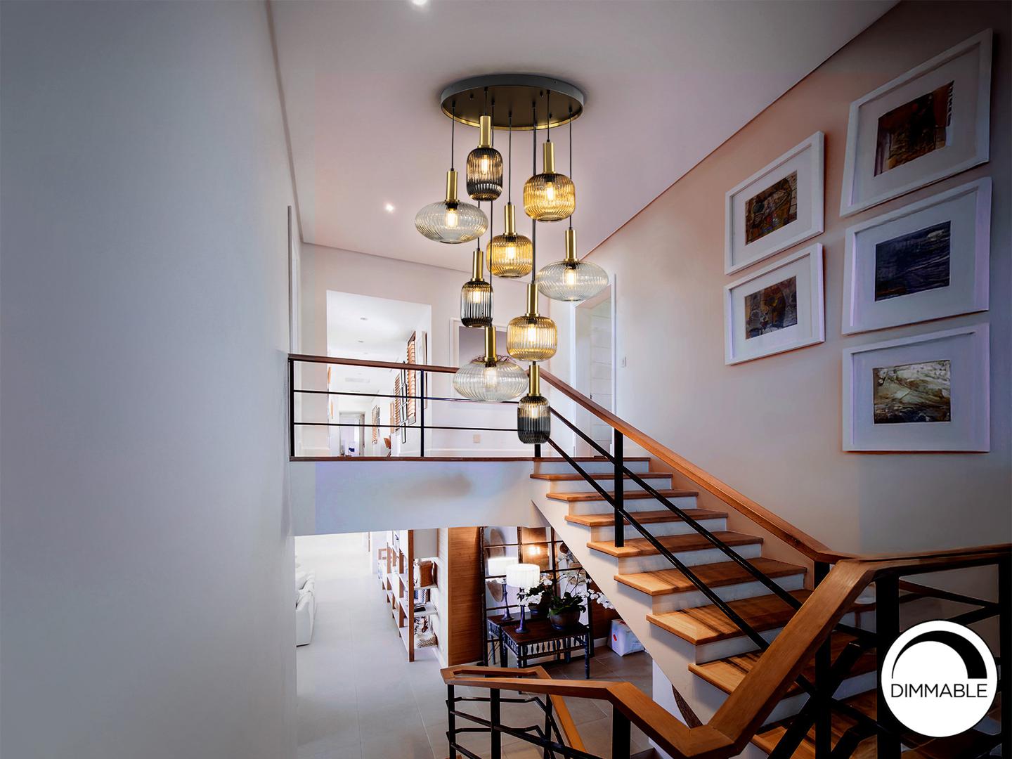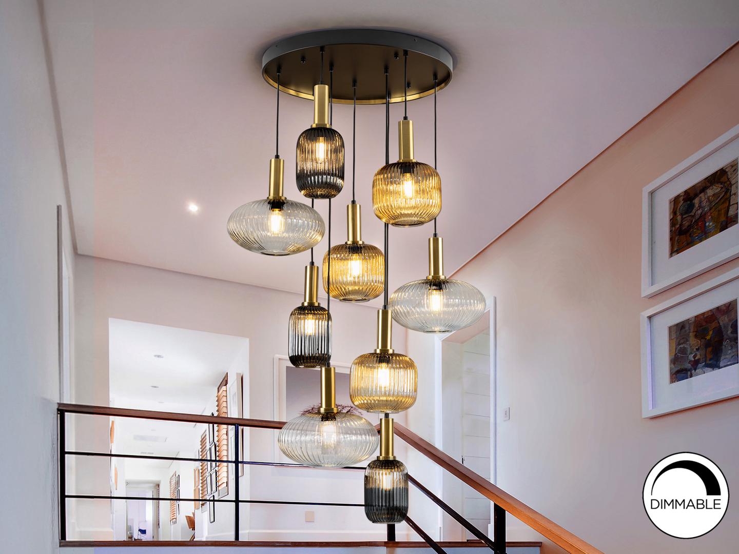 Лампа на 9 ламп из металла, отделка матово-черная, с деталями из сатинированной латуни. Абажуры из формованного стекла с прозрачной, янтарной и мерцающей дымчато-серой отделкой. Регулируется по длине до 500 см. ·В комплект поставки входят 9 светодиодов E27 мощностью 8 Вт. РЕГУЛИРУЕМАЯ ЯРКОСТЬ. Эта лампа оснащена ГРАВИТАЦИОННЫМИ ПЕРЕКЛЮЧАТЕЛЯМИ для улучшения фиксации на потолке.