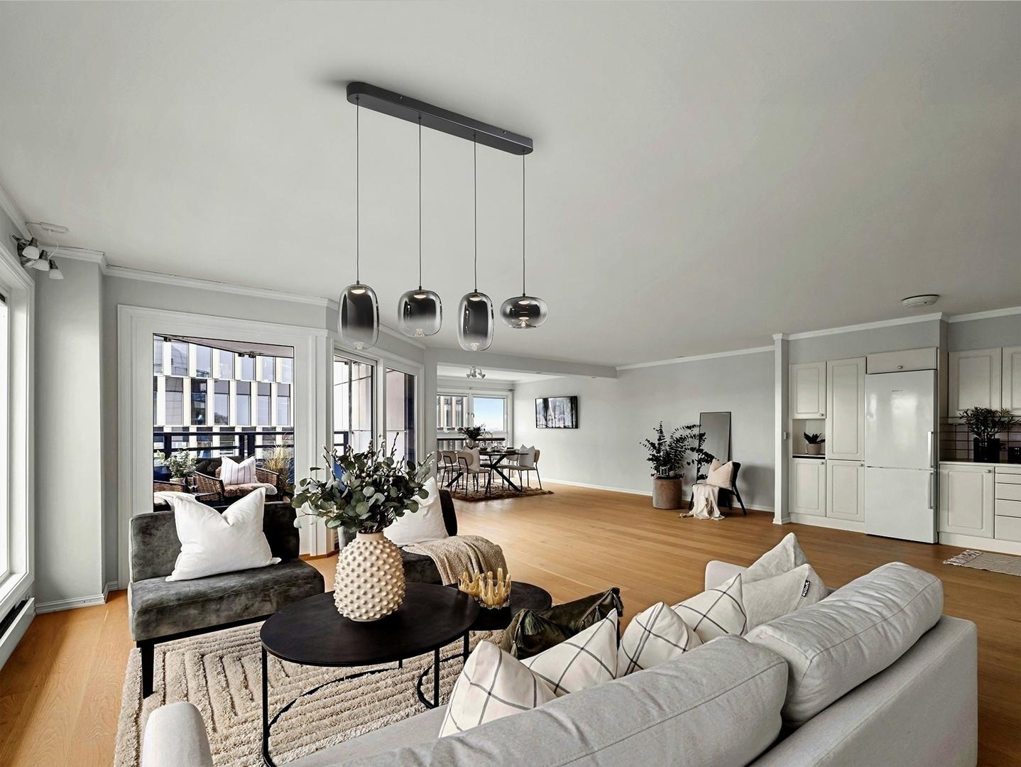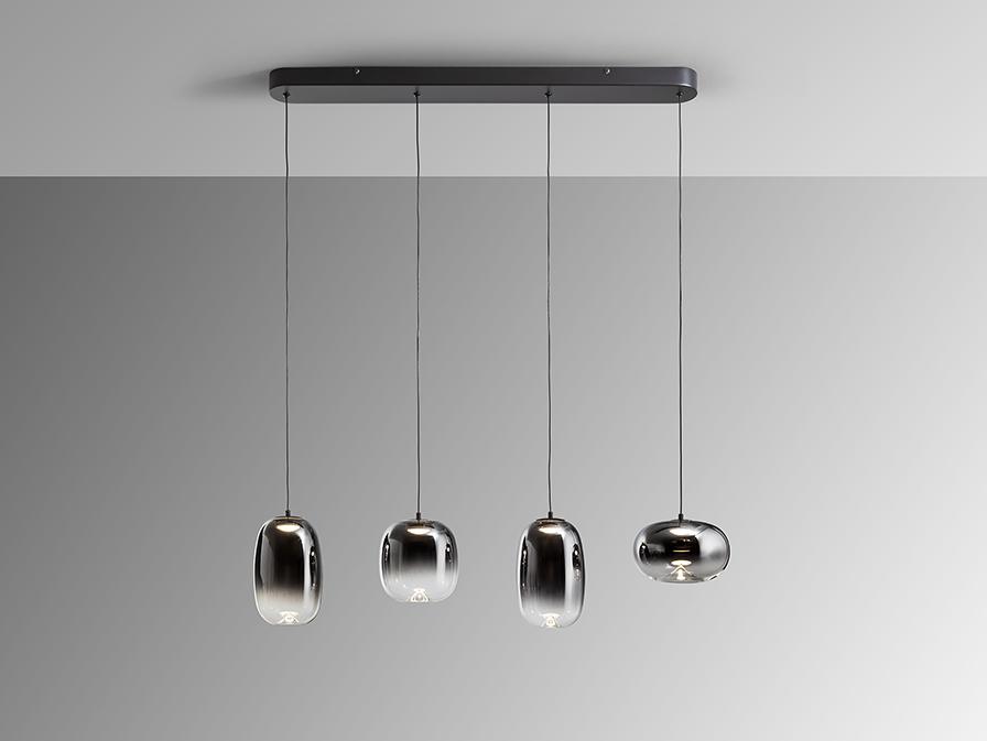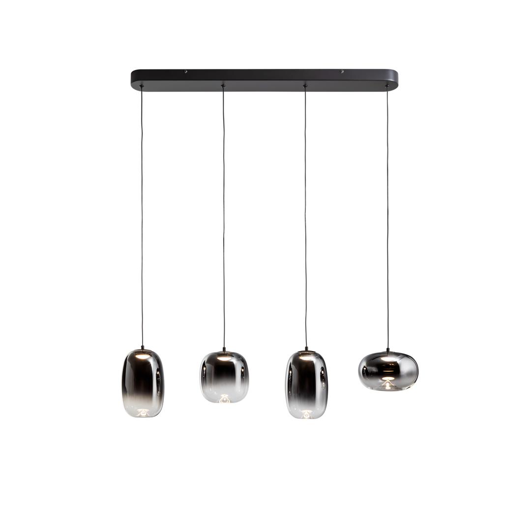 Лампа на 4 лампы из металла с матово-черной отделкой. Абажур из дутого стекла с размытой дымчато-серой отделкой, переходящей в прозрачную. Регулируемая высота. Светодиод 24 Вт, 1400 лм, 3000 К. · Эта лампа оснащена ГРАВИТАЦИОННЫМИ ПЕРЕКЛЮЧАТЕЛЯМИ для улучшения фиксации на потолке. Доступна версия на 110 В.