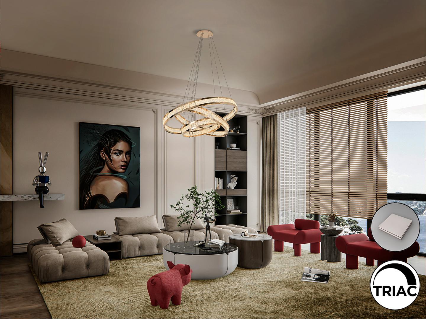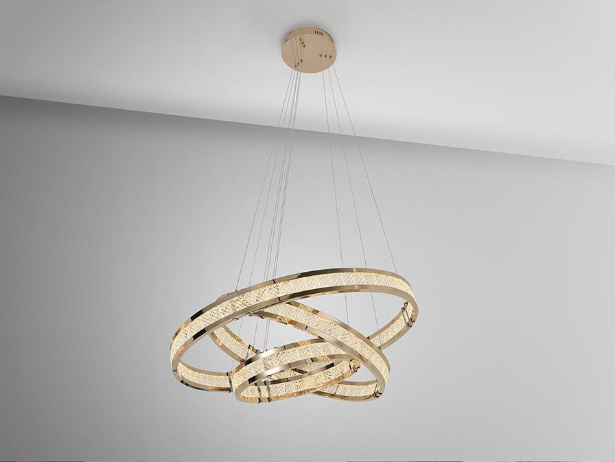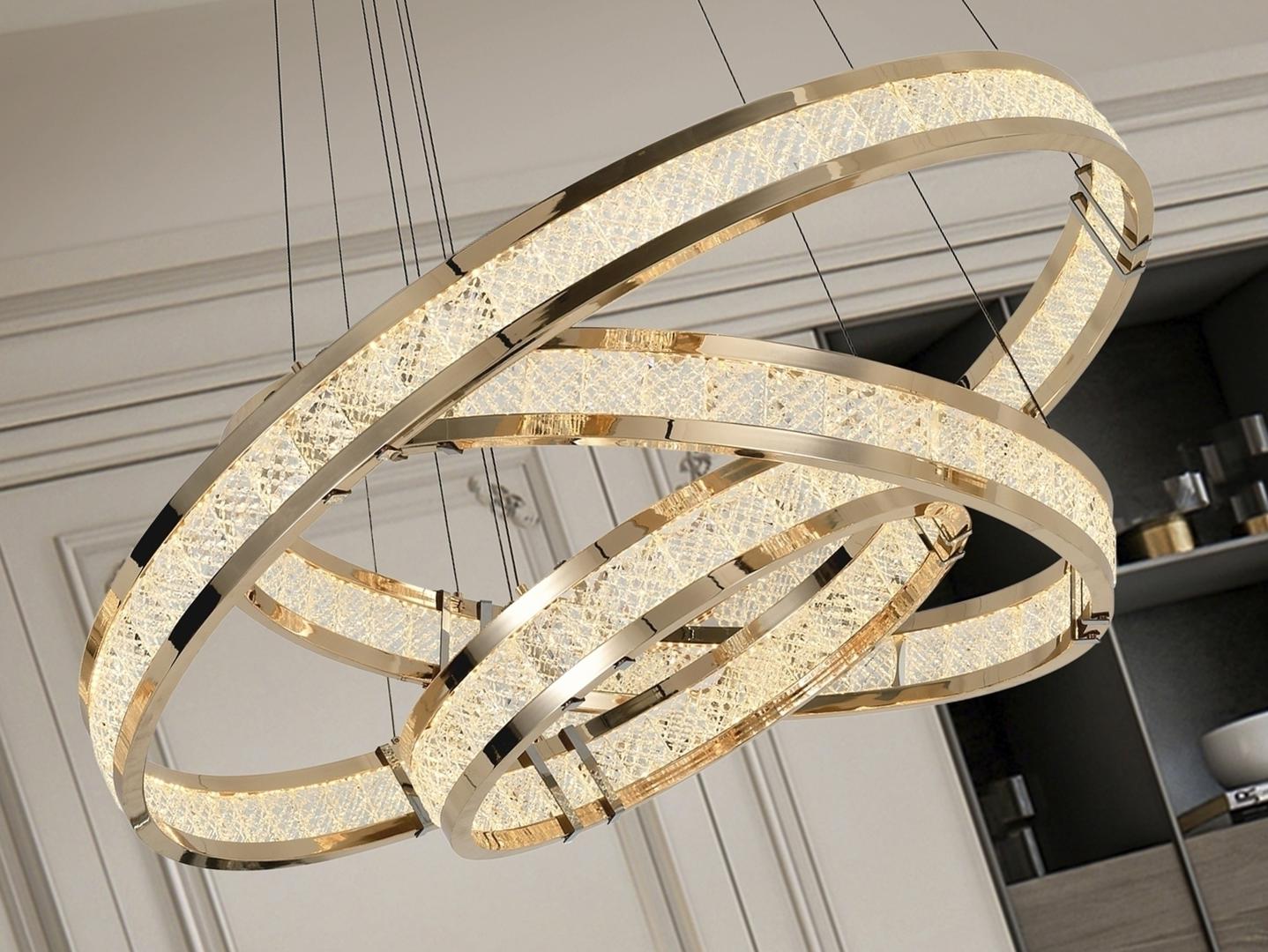 Лампа с тремя кольцами, изготовлена из стали и алюминия, блестящая золотистая отделка. Рассеиватель из текстурированных стеклянных кусочков. Регулируемая высота. Светодиодное освещение 79 Вт, 3000 К, 6300 лм. В комплект входят драйвер TRIAC и КОМПЛЕКТ ДЛЯ ДИММИРОВАНИЯ · Эта лампа поставляется с ГРАВИТАЦИОННЫМИ ПЕРЕКЛЮЧАТЕЛЯМИ для улучшения крепления на потолке. Этот продукт использует светодиодный драйвер с симистором и регулировкой яркости 0-10 В, включает в себя набор диммера с диммером и радиочастотным пультом дистанционного управления, или его можно регулировать с помощью симистора или настенного диммера 0-10 В... доступна версия на 110 В.