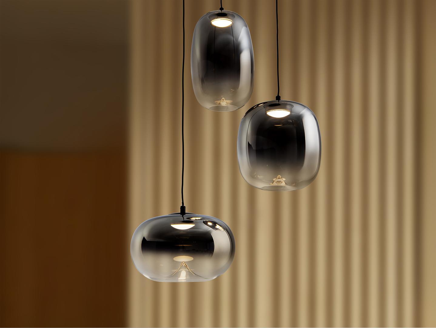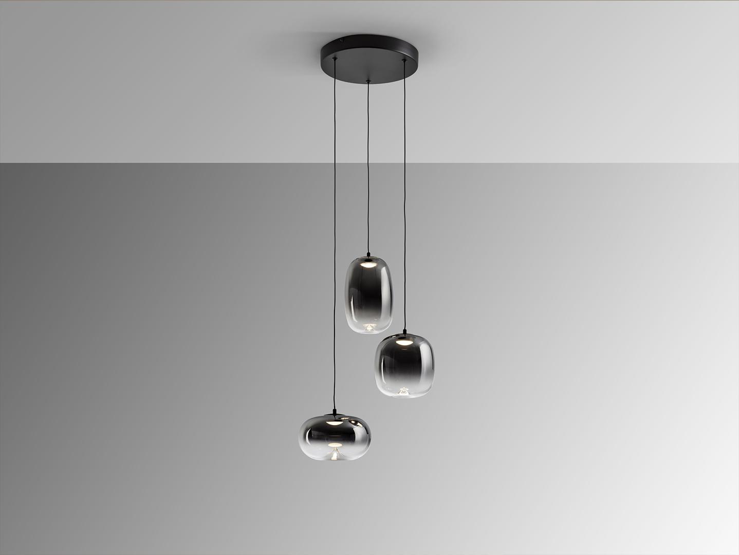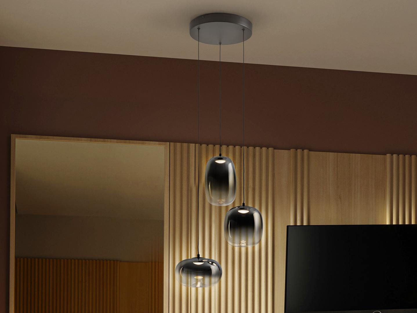 Лампа на 3 лампы из металла с матово-черной отделкой. Абажур из дутого стекла с размытой дымчато-серой отделкой, переходящей в прозрачную. Регулируемая высота. Светодиод 18 Вт, 1000 лм, 3000 К. · Эта лампа оснащена ГРАВИТАЦИОННЫМИ ПЕРЕКЛЮЧАТЕЛЯМИ для улучшения фиксации на потолке. Доступна версия на 110 В.