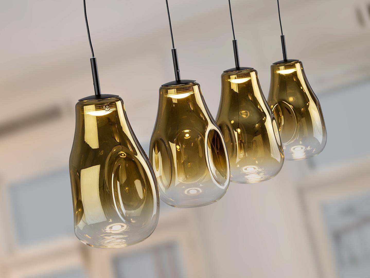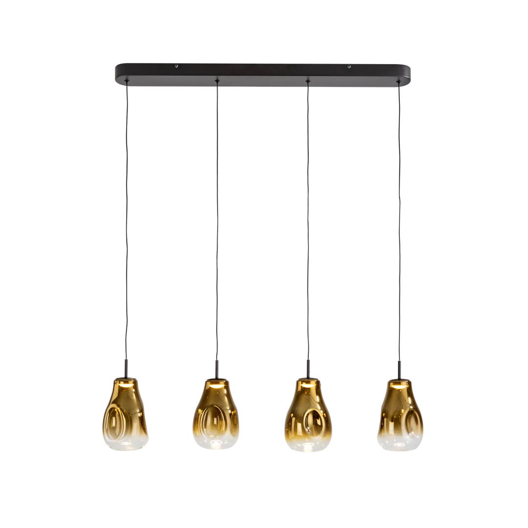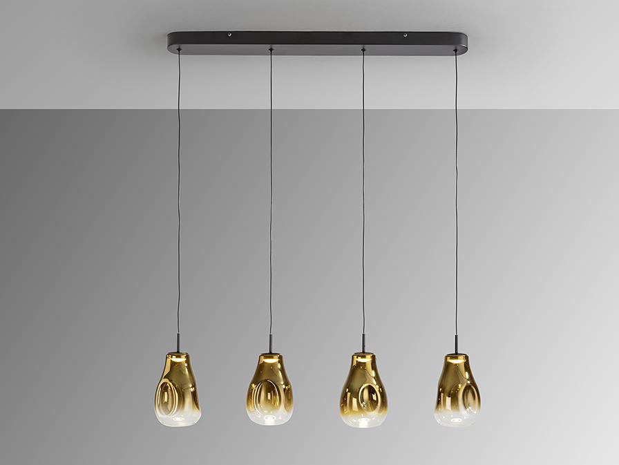 Лампа на 4 лампы из металла с матово-черной отделкой. Абажуры из дутого стекла с размытой золотистой отделкой, переходящей в прозрачную. Регулируемая высота. Светодиод 24 Вт, 1400 лм, 3000 К. · Эта лампа оснащена ГРАВИТАЦИОННЫМИ ПЕРЕКЛЮЧАТЕЛЯМИ для улучшения фиксации на потолке. Доступна версия на 110 В.