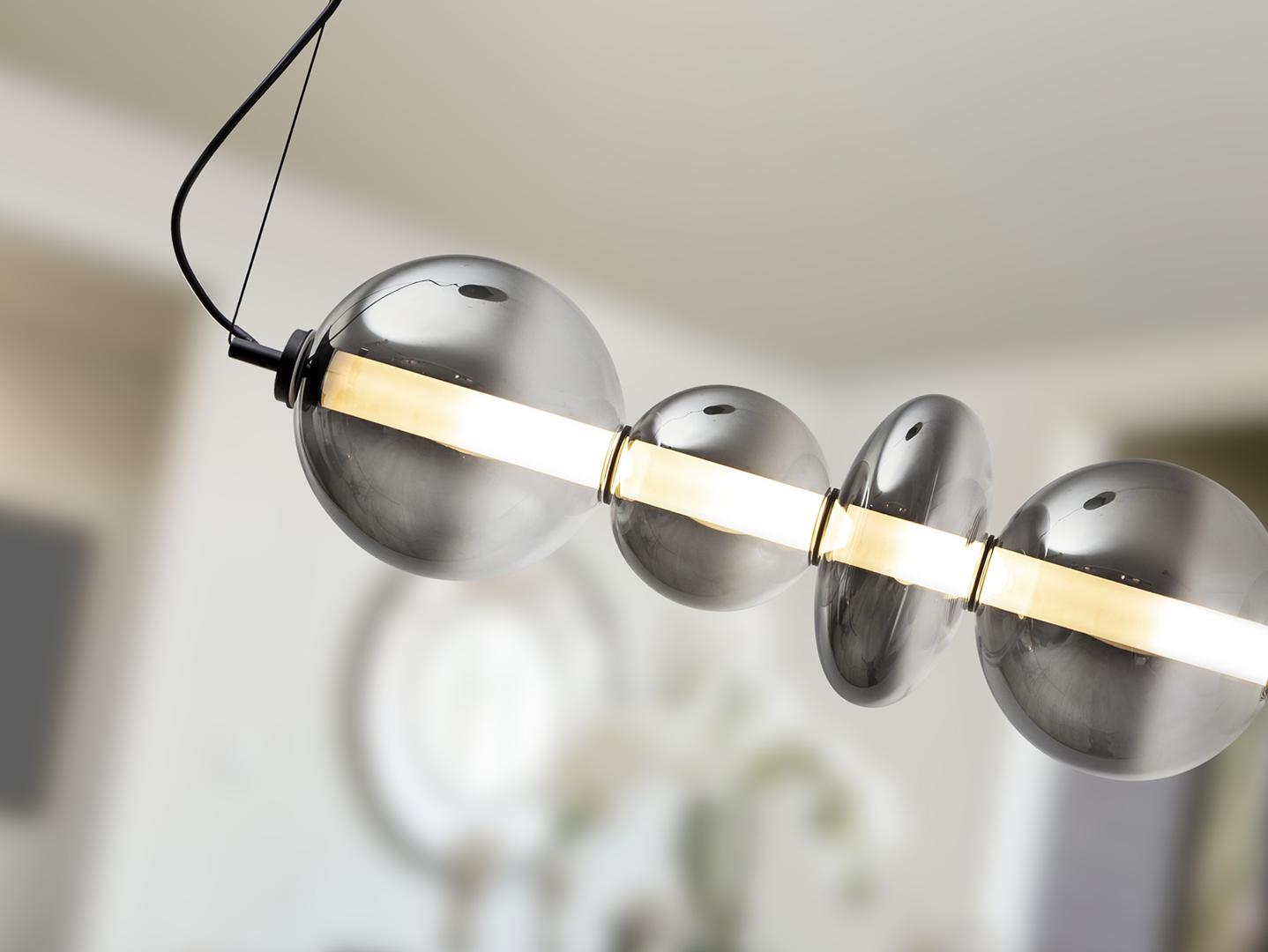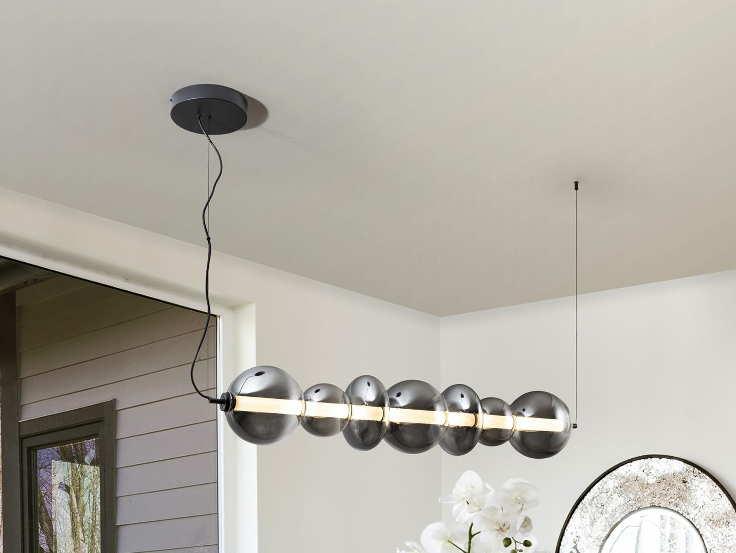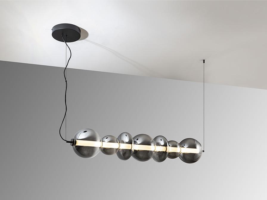 Лампа из металла, матово-черная отделка, с внутренним опаловым цилиндром и абажурами из дутого стекла, с размытой дымчато-серой отделкой, переходящей в прозрачную. Регулируется по высоте. Может устанавливаться в горизонтальном и вертикальном положении. Светодиод 24 Вт, 4000 лм, 3000 К. · Эта лампа оснащена ГРАВИТАЦИОННЫМИ ПЕРЕКЛЮЧАТЕЛЯМИ для улучшения фиксации на потолке. Доступна версия на 110 В.