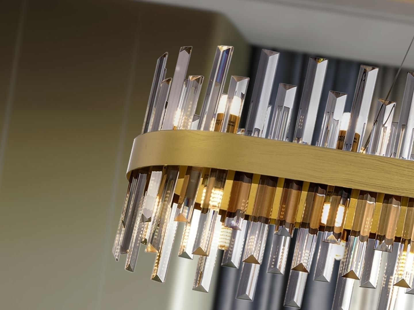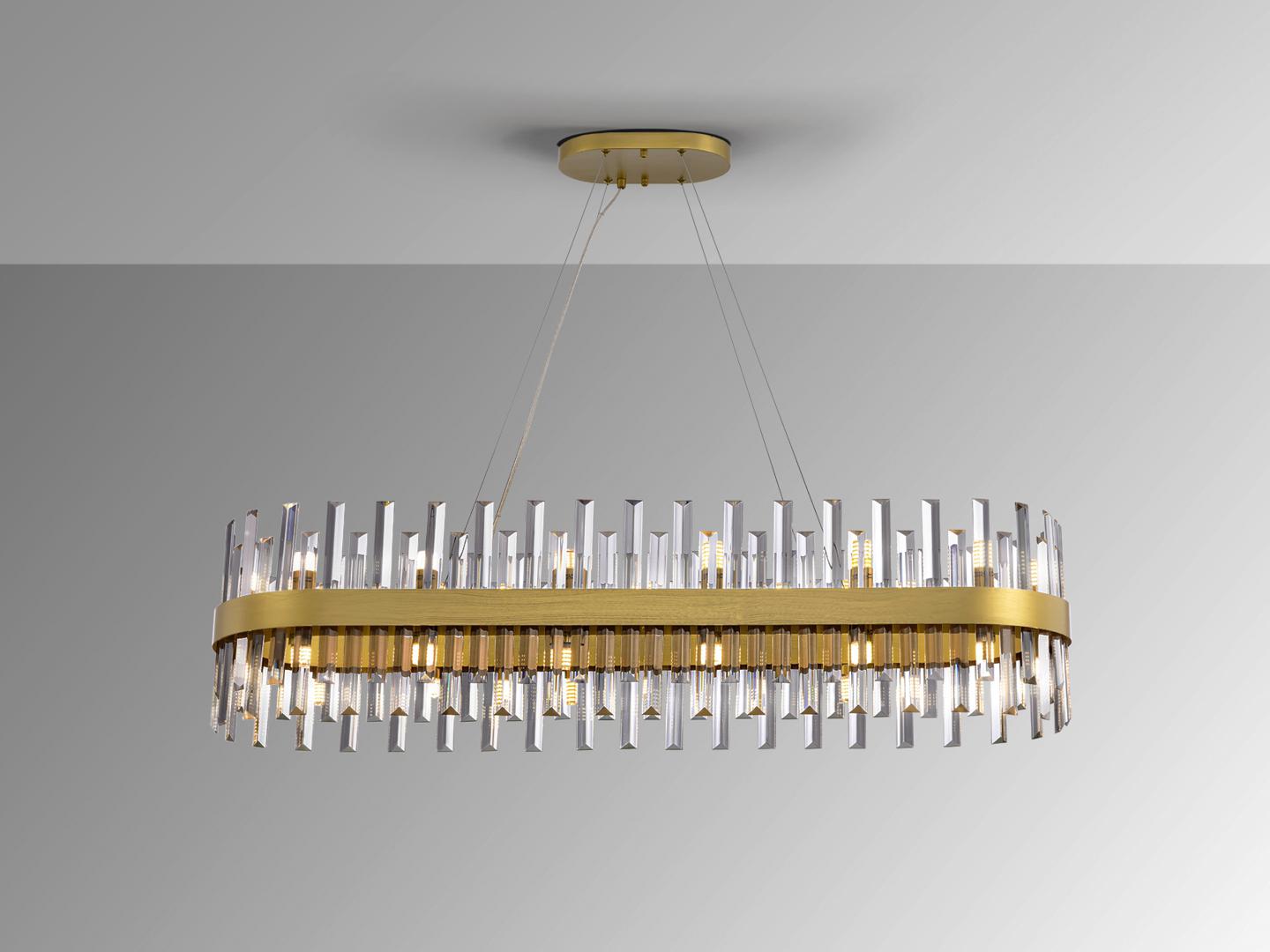 Овальная люстра на 28 ламп из матового металла с золотым покрытием. Рассеиватель из прозрачных стеклянных прутков призматической формы. ·В комплект поставки входят 28 светодиодных ламп G9 мощностью 4 Вт. Лампа оснащена GRAVITY TOGGLES для улучшения фиксации на потолке.