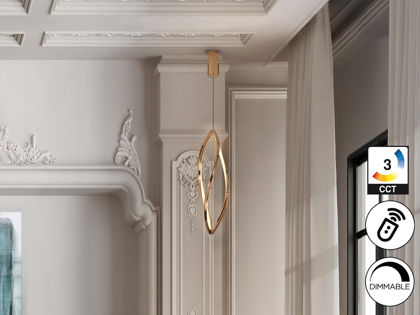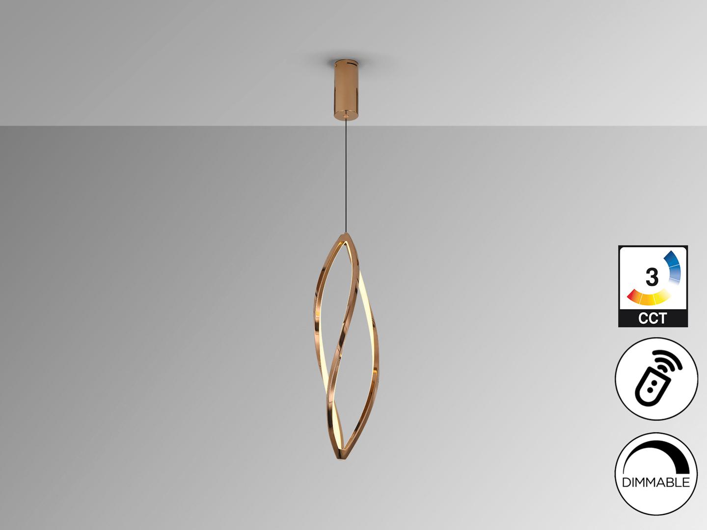 Лампа со светодиодной подсветкой, функцией DIMING и возможностью изменения цветовой температуры. Изготовлена из стали с отделкой под розовое золото. Опаловый акриловый рассеиватель. Регулируемая высота. Светодиодная подсветка мощностью 35 Вт, 2700–6500 К. В комплекте пульт дистанционного управления. · Эта лампа поставляется с креплениями GRAVITY TOGGLES для более надёжной фиксации на потолке. В этом изделии используется диммер и пульт дистанционного управления для регулировки яркости и цветовой температуры.