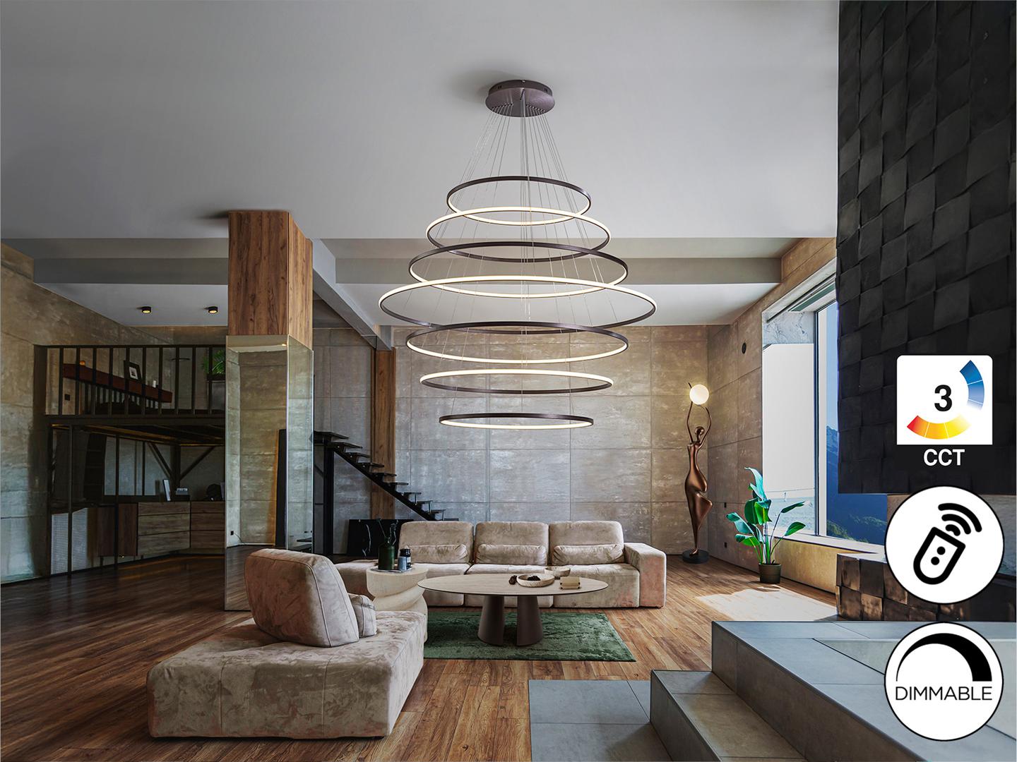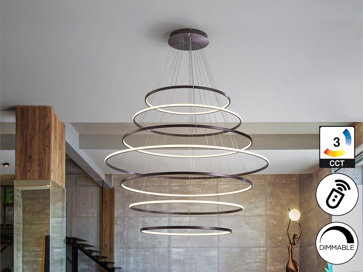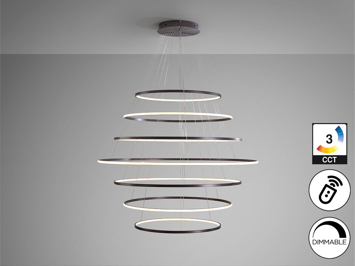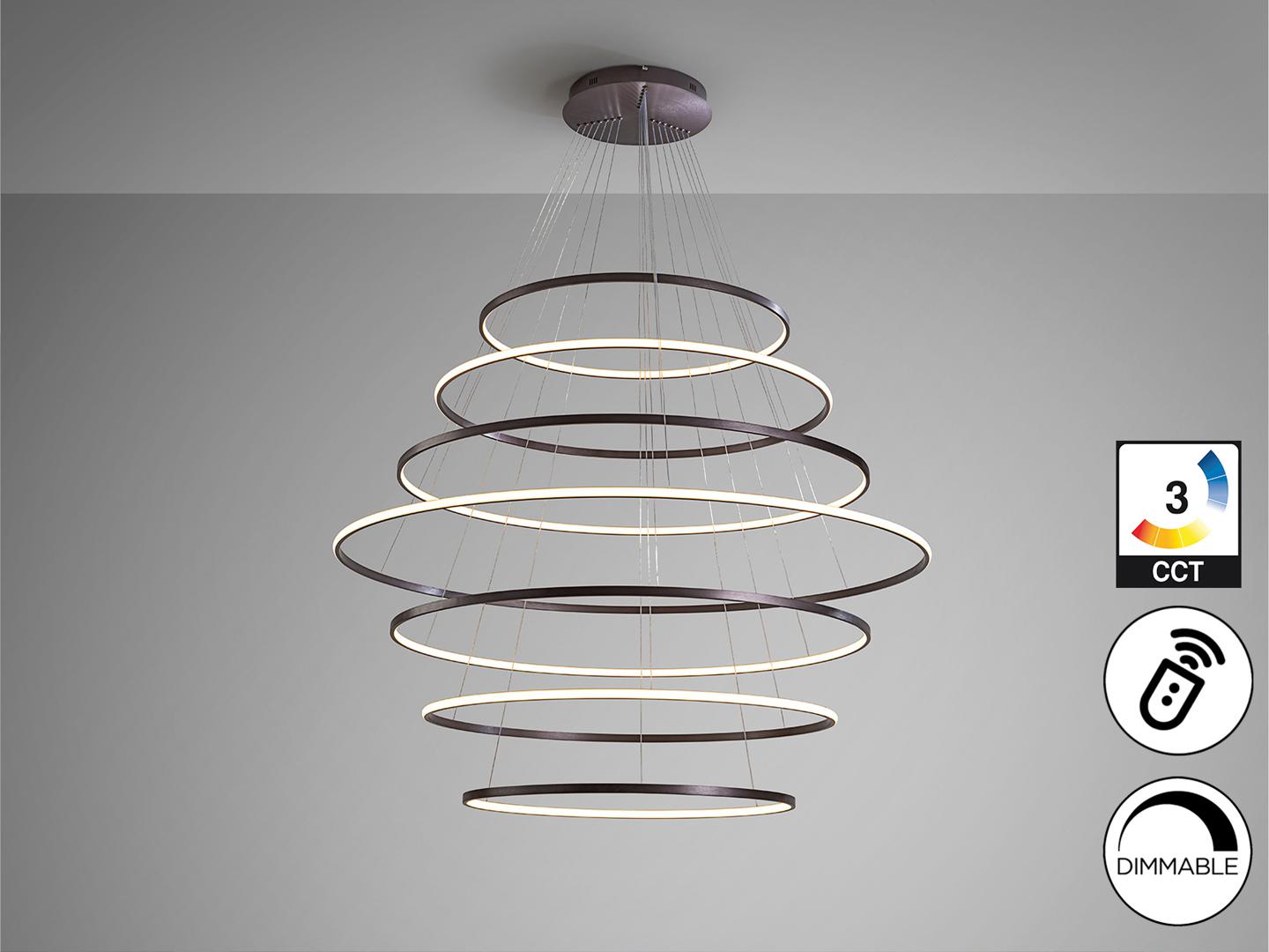 Семисекционная лампа из алюминия с покрытием цвета тёмной бронзы. Рассеиватель из силикона. Светодиод 220 Вт, 11000 лм. Цветовая температура: 2700–5000 К. Регулировка яркости. В комплекте пульт дистанционного управления. · Этот светильник оснащен системой GRAVITY TOGGLES для лучшего крепления на потолке. В светильнике используется диммер и радиочастотный пульт дистанционного управления для регулировки интенсивности и цветовой температуры. Совместим с приложением TUYA для управления освещением со смартфона или планшета.