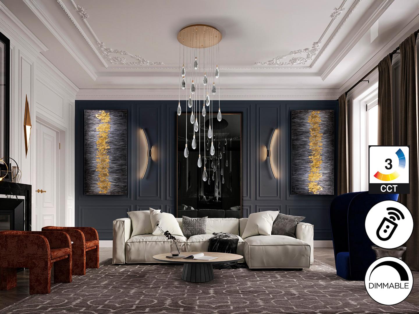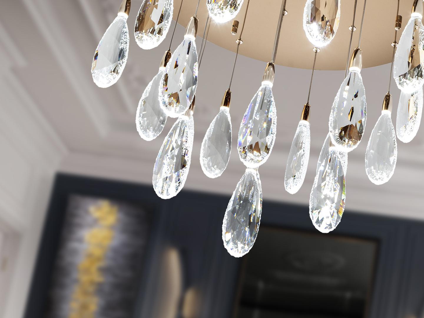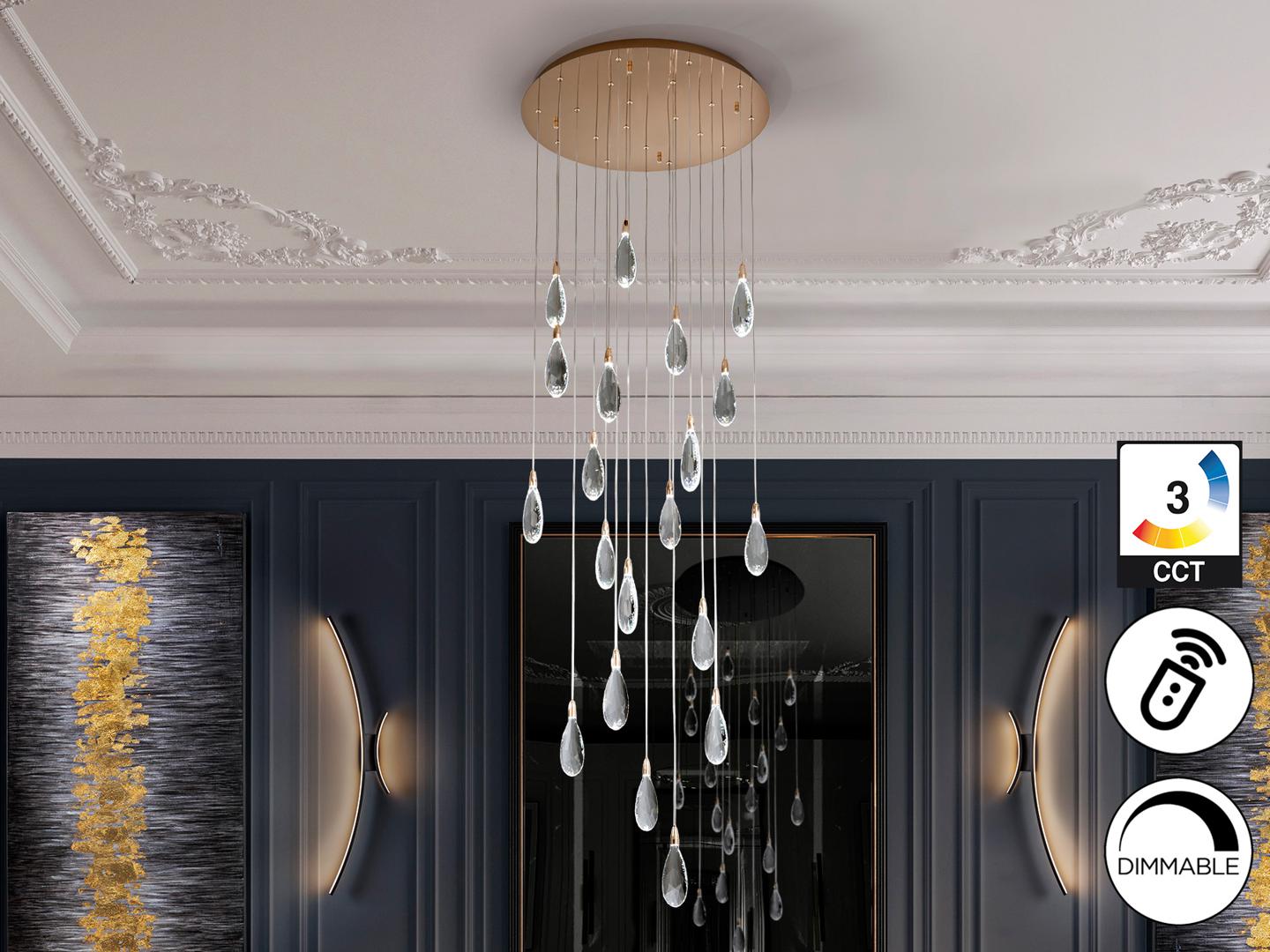 Светильник из стали и металла, отделка из розового золота. 20 лампочек с гранёными стеклянными каплями с крапинками. Регулируемая высота. Светодиодное освещение мощностью 40 Вт, цветовая температура: 2700–6000 К, 4000 лм, с регулировкой яркости. В комплекте пульт дистанционного управления. · Этот светильник оснащен системой GRAVITY TOGGLES для лучшего крепления на потолке. В светильнике используется диммер и радиочастотный пульт дистанционного управления для регулировки интенсивности и цветовой температуры. Совместим с приложением TUYA для управления освещением со смартфона или планшета.