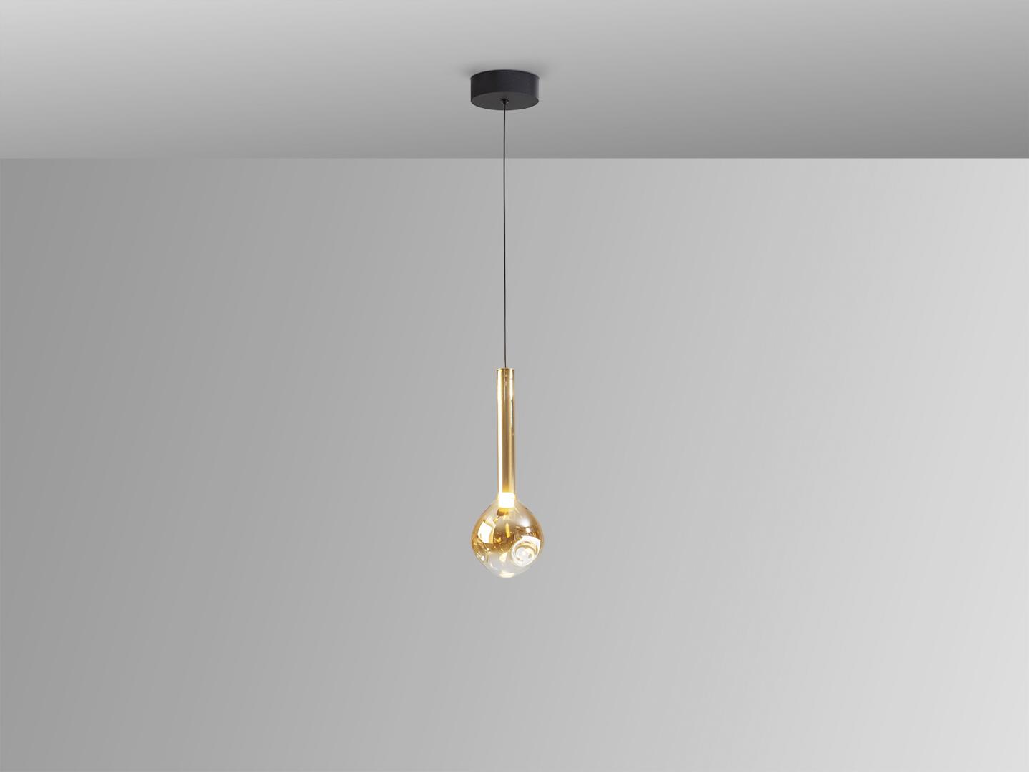 Светильник изготовлен из металла с матово-черным и золотистым покрытием. Абажур из янтарного стекла с переходом в прозрачный. Регулируемая высота. Светодиод мощностью 4 Вт, цветовая температура 3000 К. Световой поток 240 лм. · Этот светильник оснащен GRAVITY TOGGLES для улучшения фиксации на потолке.