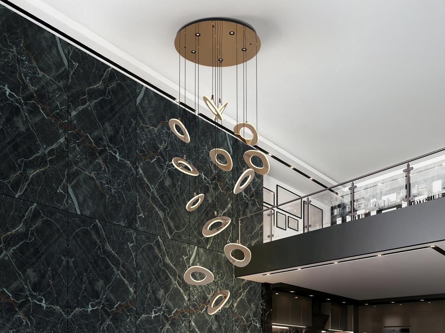 Светильник с 13 лампами и 5 зенитными прожекторами. Изготовлен из стали с покрытием из блестящего розового золота. Рассеиватель из опалового акрила. Регулируемая высота. Светодиодное освещение мощностью 260 Вт, цветовой температурой 2700 К. · Этот светильник оснащен GRAVITY TOGGLES для улучшения фиксации на потолке.