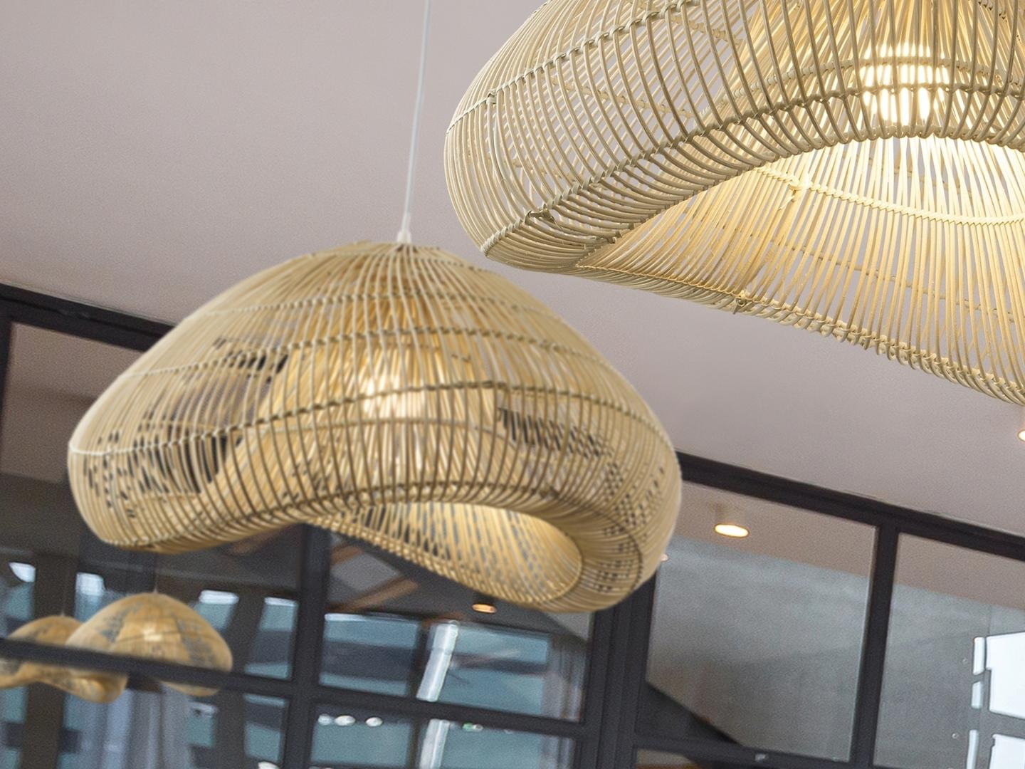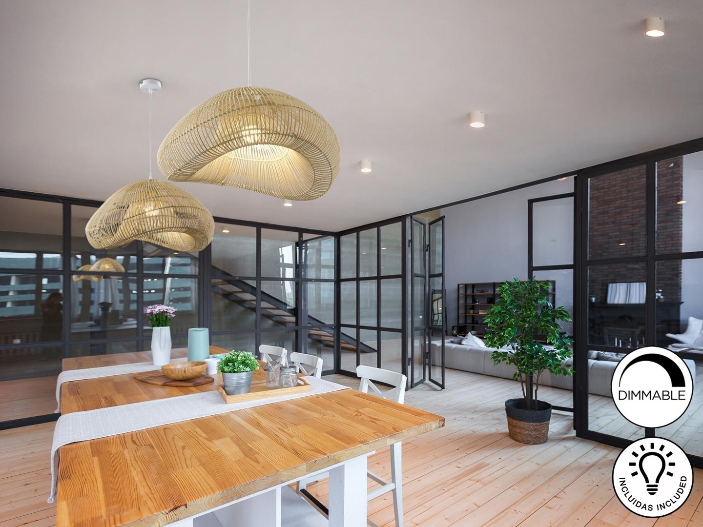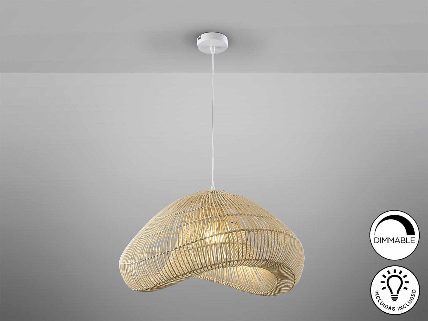 Светильник на 1 лампу из металла, белая отделка. Ротанговый оттенок, натуральный финиш. ·В комплект входит 1 светодиод E27 мощностью 8 Вт. ДИМАБЕЛЬ Эта лампа поставляется с ГРАВИТАЦИОННЫМИ ПЕРЕКЛЮЧАТЕЛАМИ для улучшения крепления к потолку.