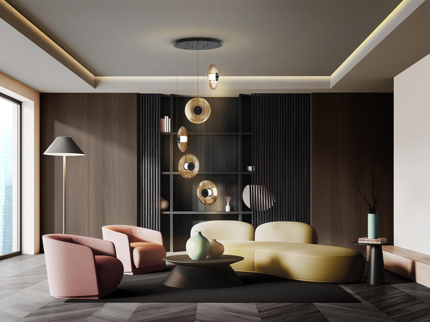 Светильник из металла черного цвета. 5 плафонов из янтарного стекла. Регулируется по высоте. Светодиод мощностью 60 Вт, цветовая температура 3000 К. Световой поток 3600 лм. · Этот светильник оснащен системой GRAVITY TOGGLES для улучшения потолочного крепления. В светильнике используется светодиодный драйвер с симистором и регулировкой яркости 0–10 В, а также комплект диммера с диммером и радиочастотным пультом дистанционного управления. Регулировка яркости возможна с помощью симистора или настенного диммера 0–10 В.