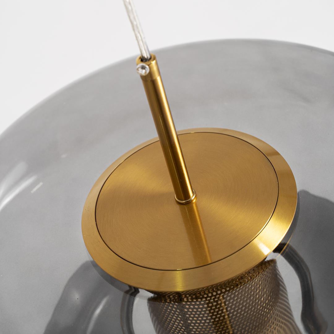 Подвесной светильник Gala в стиле ар-деко, выполнен из серого стекла с полупрозрачной отделкой в сочетании с золотистым железом. Изделие разборное. Ширина: 35 см, Глубина: 35 см, Высота: 35 см