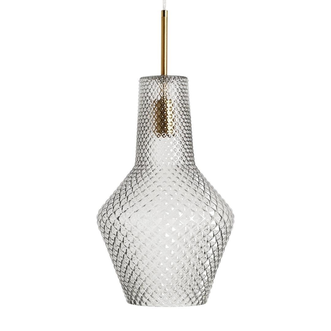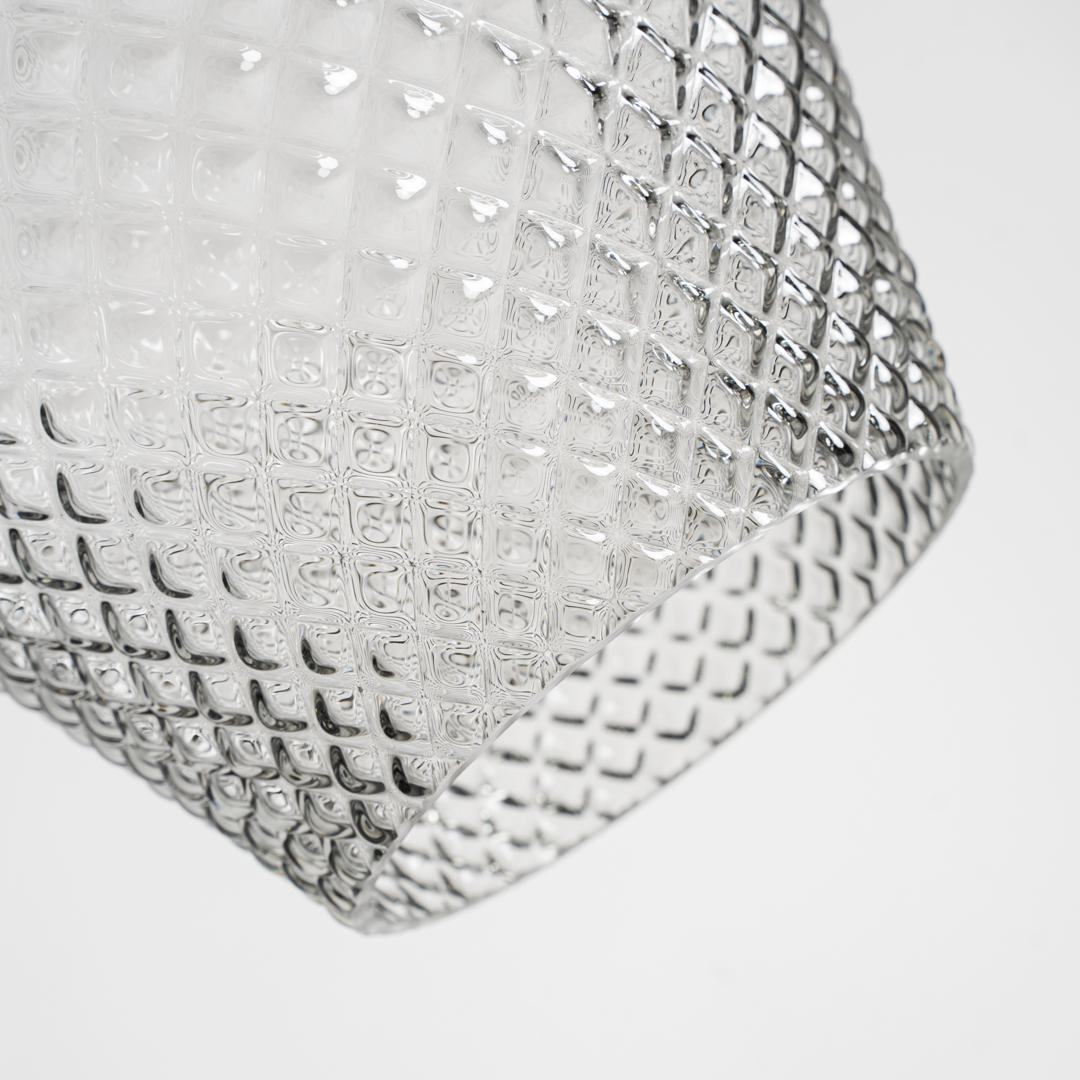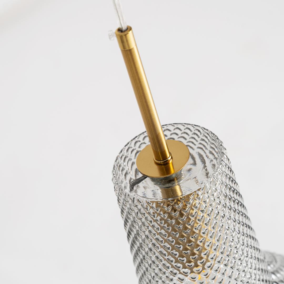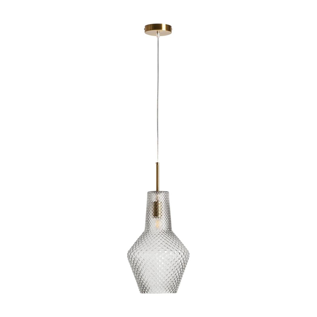 Подвесной светильник Camelia в винтажном стиле, изготовлен из прозрачного стекла с ребристым покрытием в сочетании с золотистым железом. Изделие в разобранном виде. Ширина: 25 см, Глубина: 25 см, Высота: 52 см