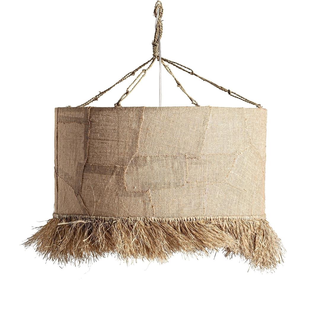 Подвесной светильник в стиле бохо, изготовлен из коричневого джута.