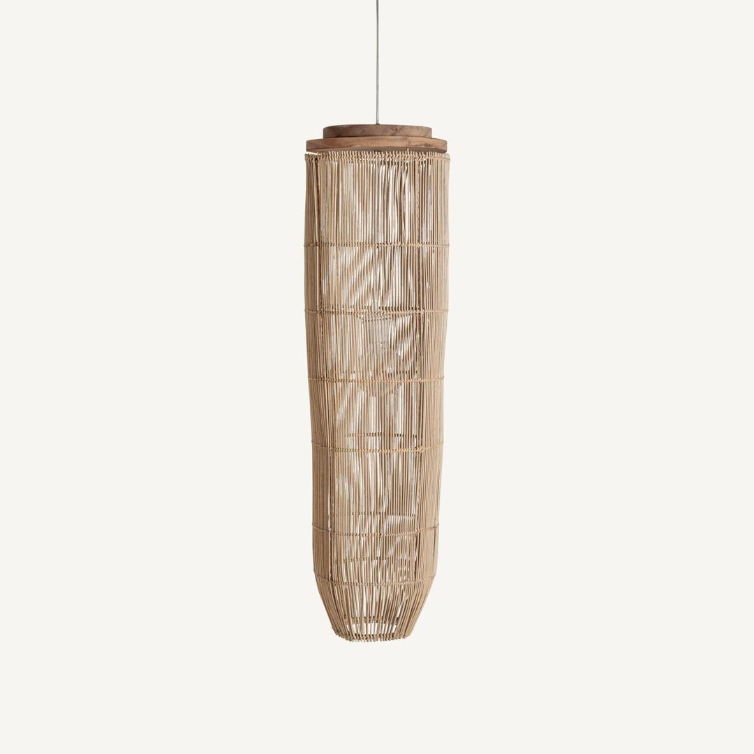 Подвесной светильник, изготовленный из светло-коричневого ротанга в сочетании с коричневой древесиной суара. Ширина: 26 см, Глубина: 26 см, Высота: 96 см