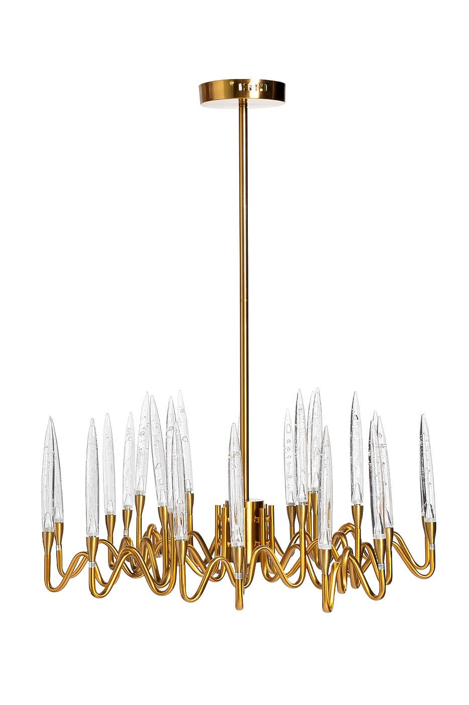 description-full - В прошлые эпохи подвешенные к потолку люстры были неотъемлемой частью роскошных залов дворцов и королевских замков. Люстра играет важную роль в планировании и создании настроения помещения. Правильное освещение и удачное оформление люстры способно подчеркнуть красоту и эстетику, внеся в интерьер тот самый недостающий акцент. Подвесную люстру можно расположить над обеденным столом или в гостиной над местом сбора гостей. Каркас люстры выполнен из латуни. А необычная форма изделия из прозрачного стекла добавляет красоты и изящества любому современному пространству. Рекомендованная площадь освещения 20-24 м2