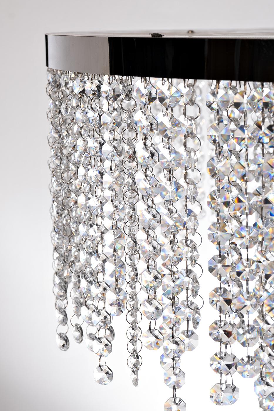 description-full - Люстра Каскад (Cascada) представляет собой предмет интерьерного искусства, в котором дизайнеры воплотили самые актуальные идеи. Слои стеклянный подвесок, объединенных лаконичными хромированными кольцами, визуально напоминает водопад, низвергающийся уступами. Мелкие округлые кристаллы из стекла создают неповторимую игру света. Такой осветительный шедевр подойдет для размещения в современных и неоклассических помещениях с высокими потолками – гостиных, холлах, столовых комнатах.