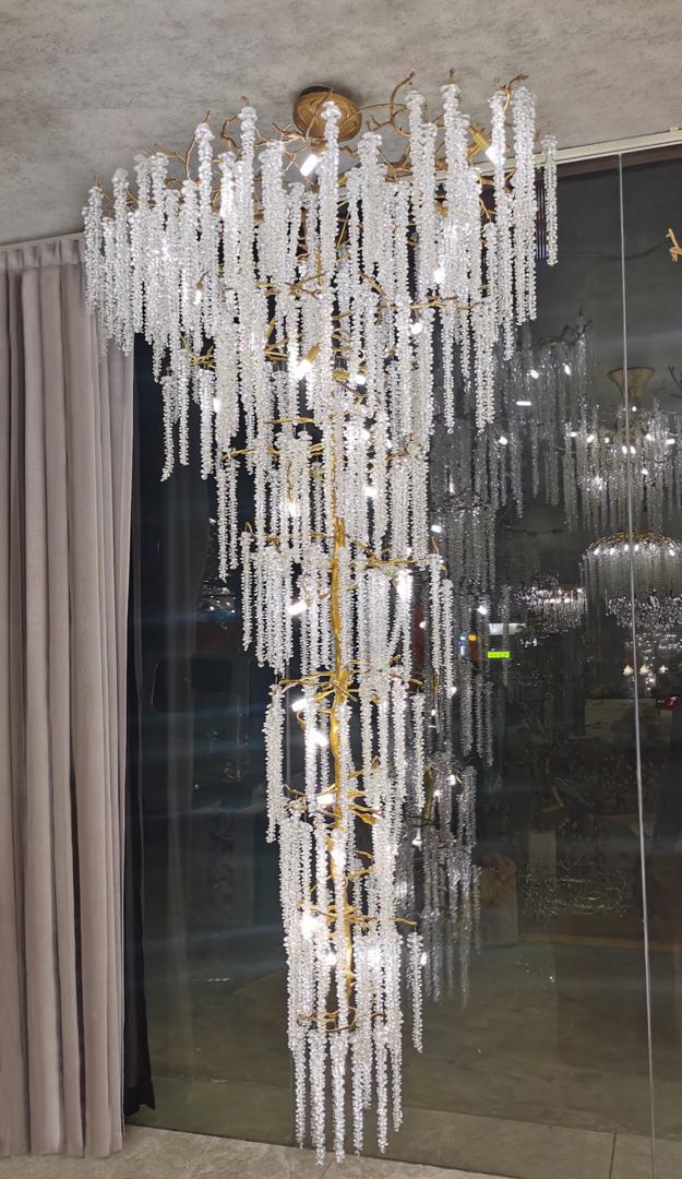description-full - Эта роскошная потолочная люстра словно парит в пространстве, превращая свет в поэтическую инсталляцию. Каскады стеклянных подвесов струятся по золотистому каркасу, напоминая капли росы на ветвях дерева. Эффектная и масштабная, эта дизайнерская люстра для высоких потолков формирует динамику интерьера и подчёркивает его вертикаль. Идеальна для гостиной, холла отеля или галерейного пространства, где свет становится частью архитектуры.