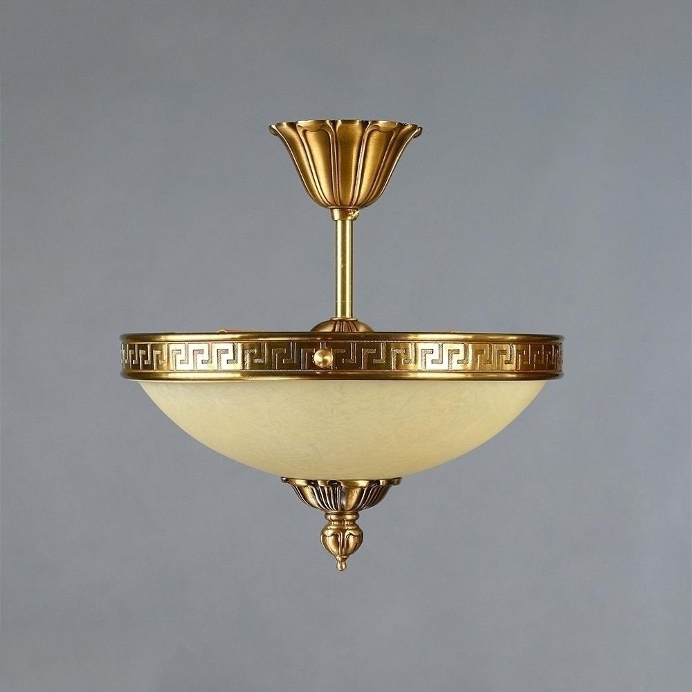 Потолочный светильник, выполненный из латуни в матовой бронзовой отделке и плафоном из стекла.