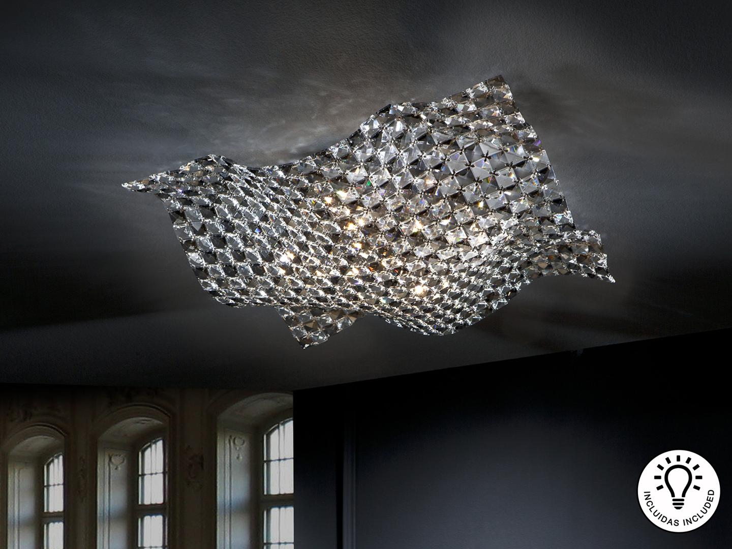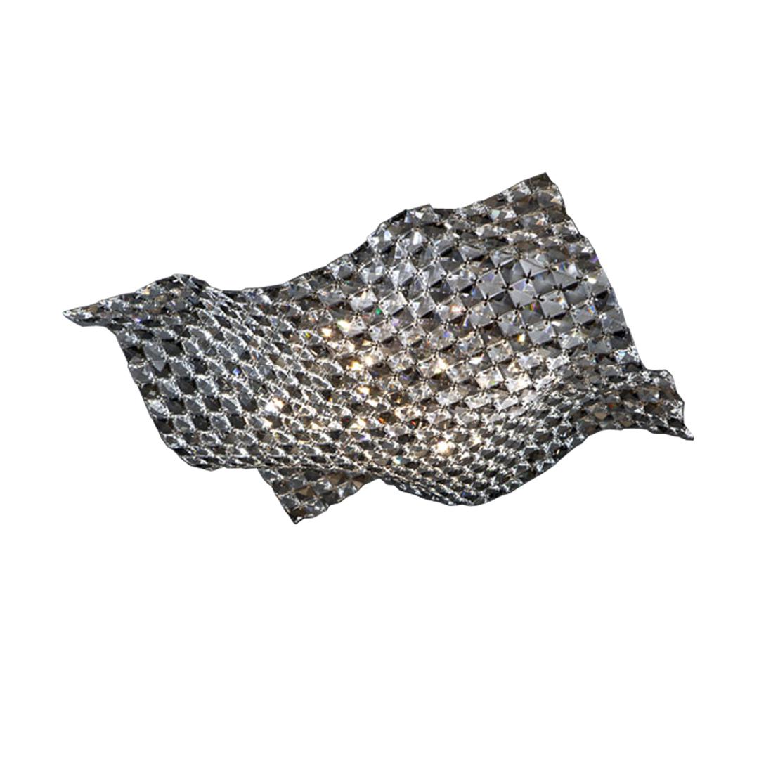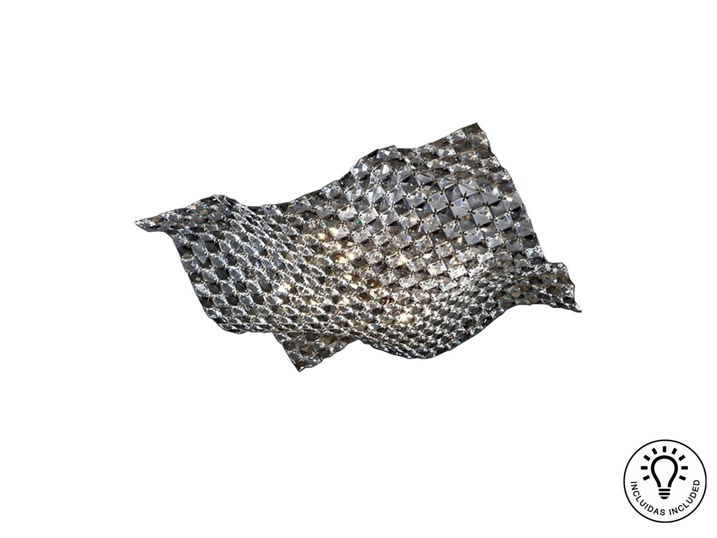 Потолочный светильник из хромированного металла, плафон из скреплённых между собой кристаллов прозрачного гранёного стекла K9 и кристаллов дымчатого цвета. Включает 5 светодиодов G9 мощностью 6 Вт.