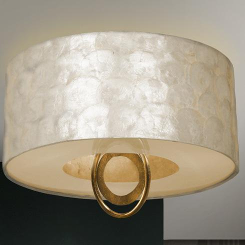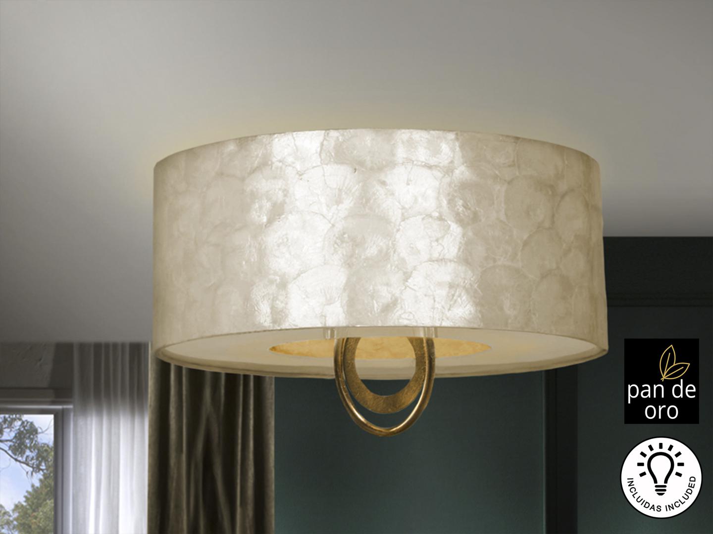 Потолочный светильник на 4 лампы из металла с отделкой GOLDEN PAN и деталей из глянцевого черного лака. Экран с аппликациями из перламутрового листа и нижним диффузором. Включает 4 светодиода E27 10 Вт.