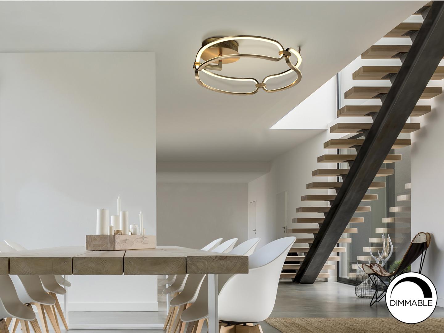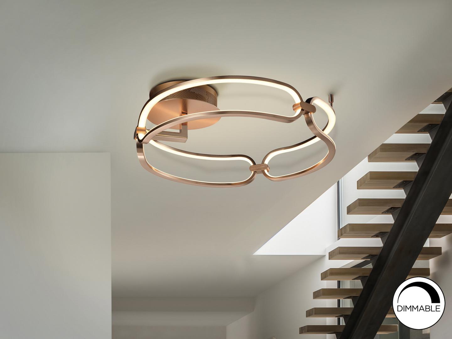 Потолочный светильник LED маленького размера, из алюминия с матовым полированным золотистым покрытием. Силиконовые рассеиватели опалового цвета, 37W LED, 3330 Lm, 3000 K. Диммируемый.