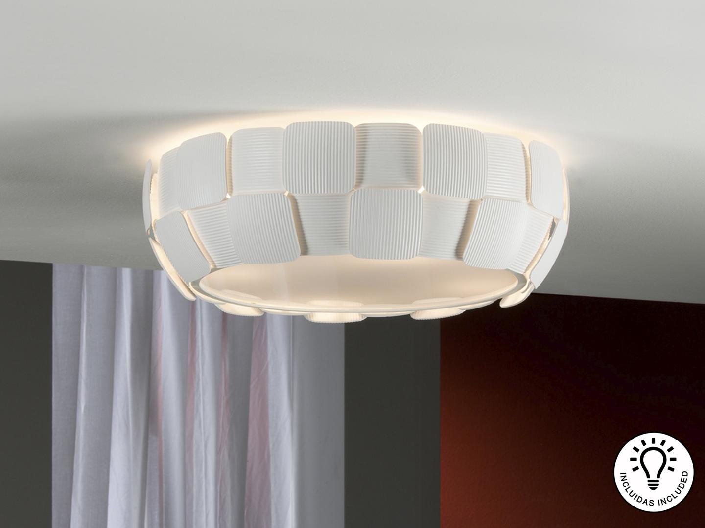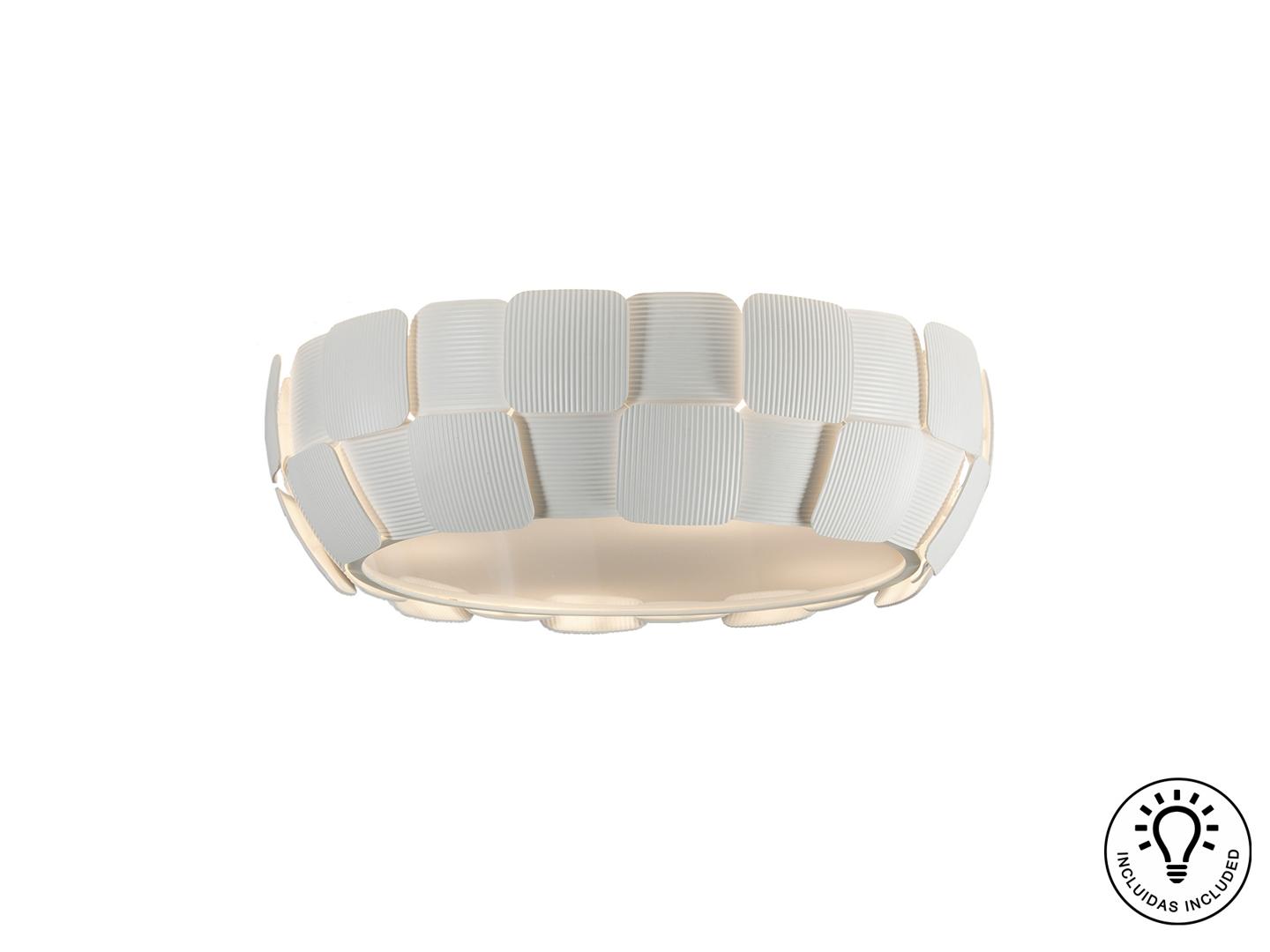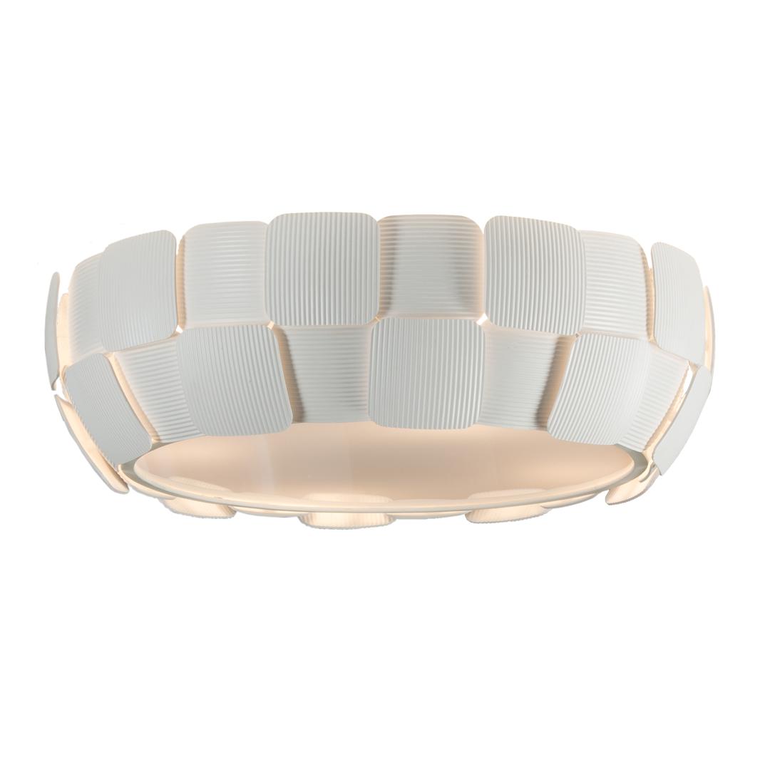 Потолочный светильник с плафоном, образованным пластинами из поликарбоната с рифлёной поверхностью. Каркас из металла с серовато-белым матовым покрытием. Нижний рассеиватель. Включает 4 светодиода E27 10 Вт.