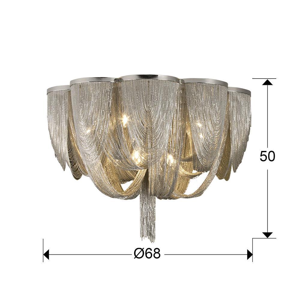 Потолочный светильник на 10 ламп, состоящий из тонких металлических цепочек с никелевым покрытием, образующих корпус лампы. Этот продукт включает в себя диммерный приемник и радиочастотный пульт дистанционного управления. · Этот элемент включает 10 светодиодов G9 мощностью 4,5 Вт. DIMMABLE.