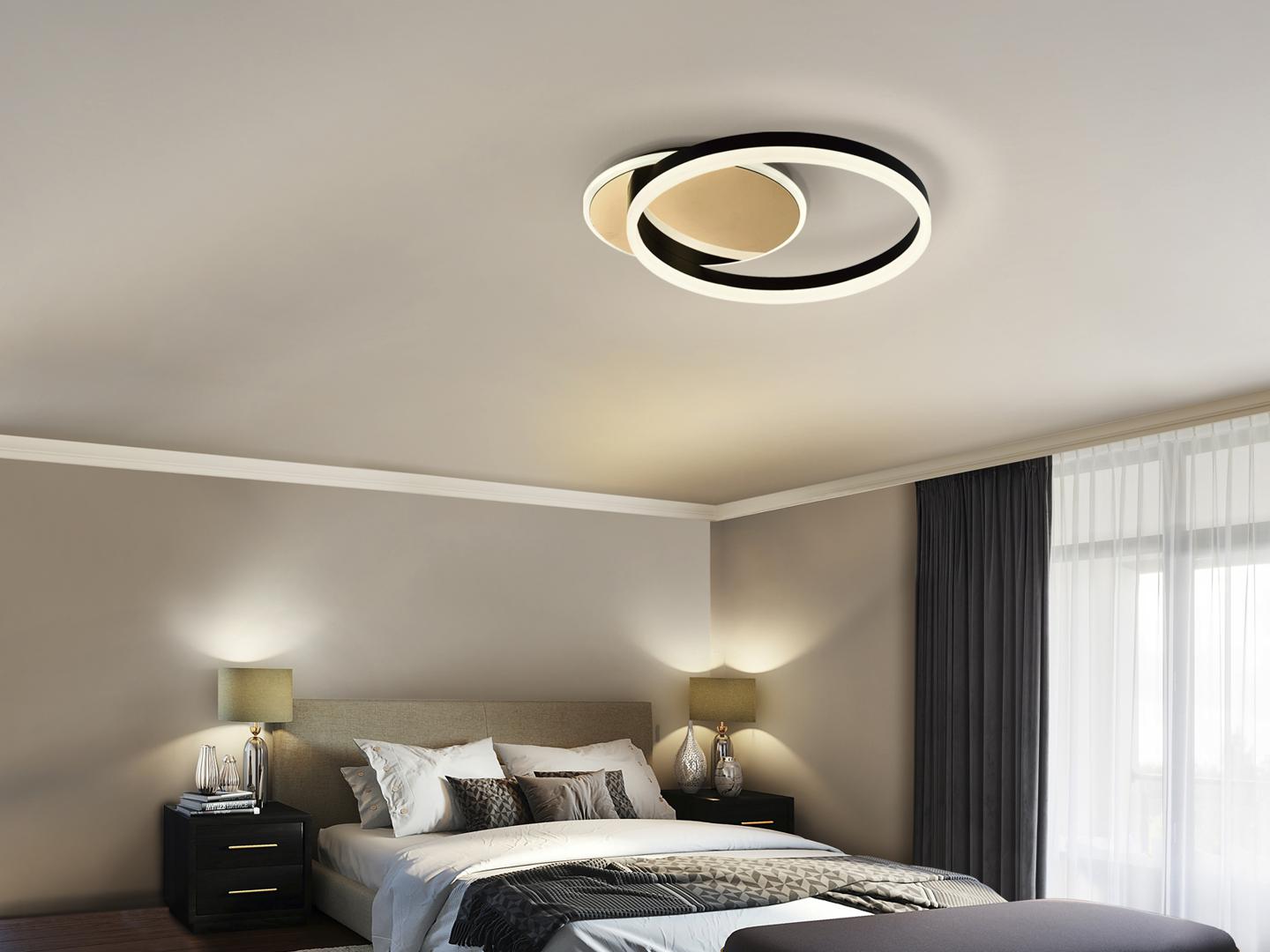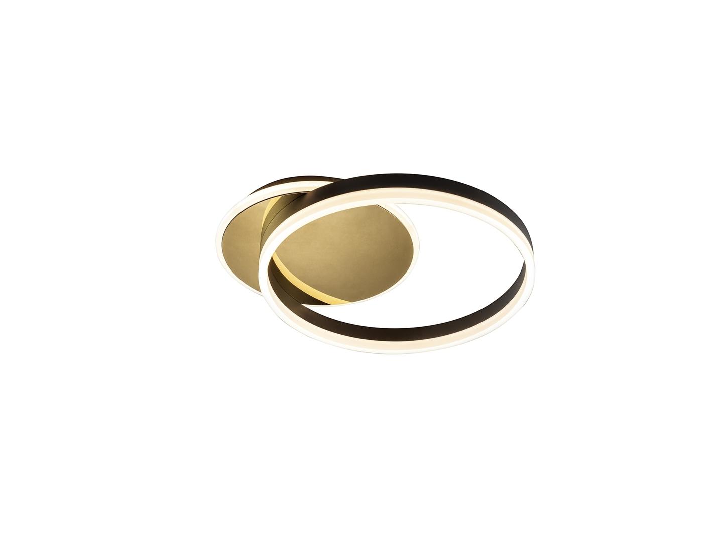 Потолочный светильник из стали с отделкой золотом и алюминия с отделкой черного матового цвета. Опаловый акриловый рассеиватель. Светодиод 38Вт. 1400 лм. 3000 К.