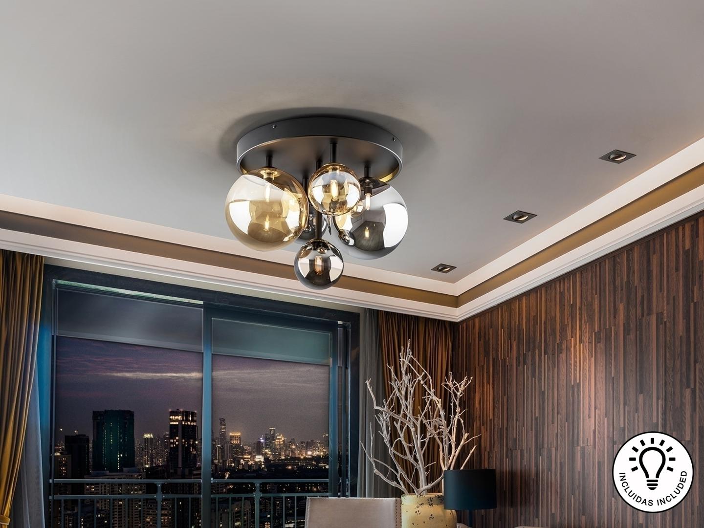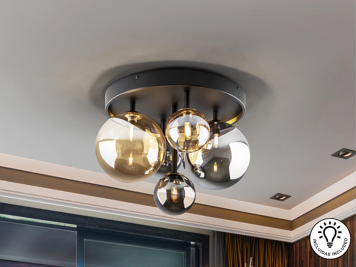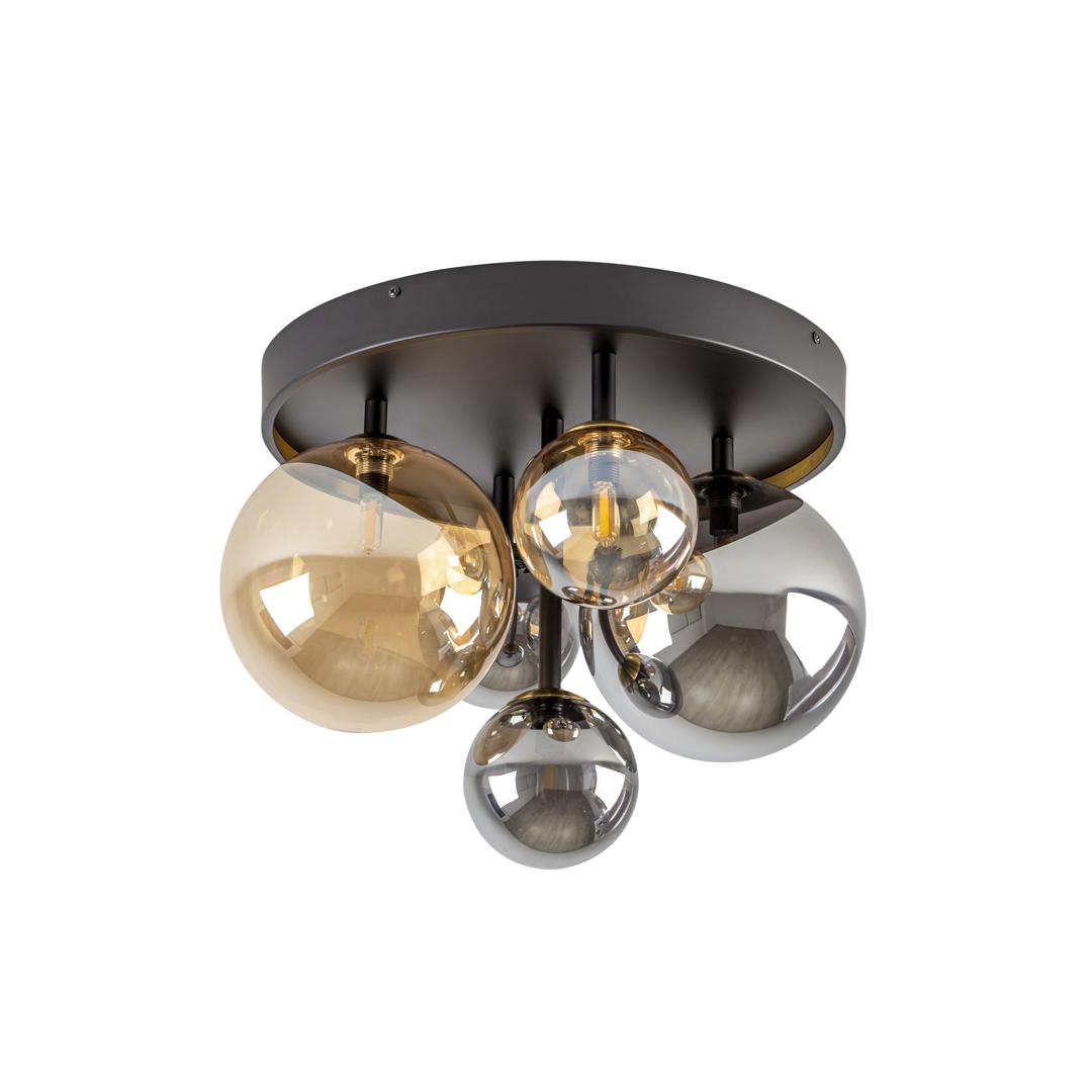 Потолочный светильник на 5 ламп из металла с матовой черной отделкой и деталями из сатинированной латуни. Сферические стеклянные плафоны диаметром 12 и 20 см в янтарном и зеркальном дымчато-сером исполнении. ·Этот товар включает в себя 5 светодиодов G9 4 Вт.