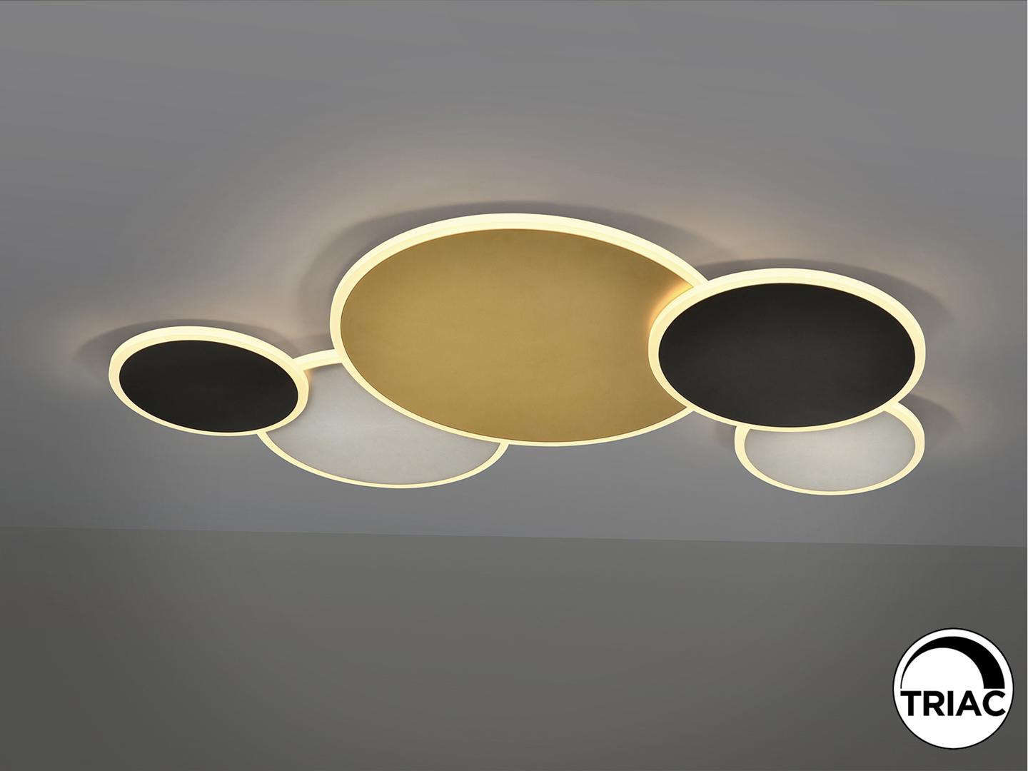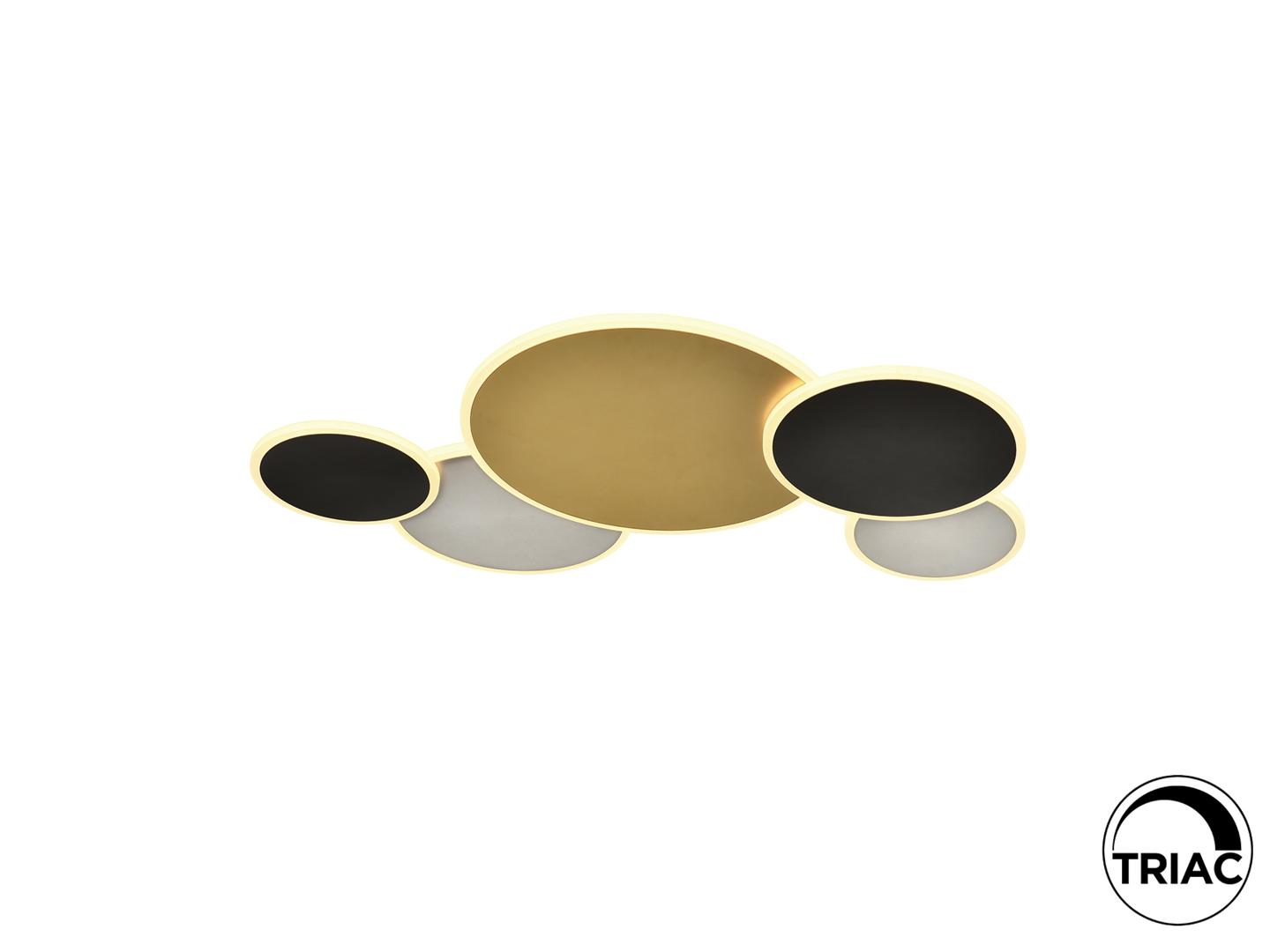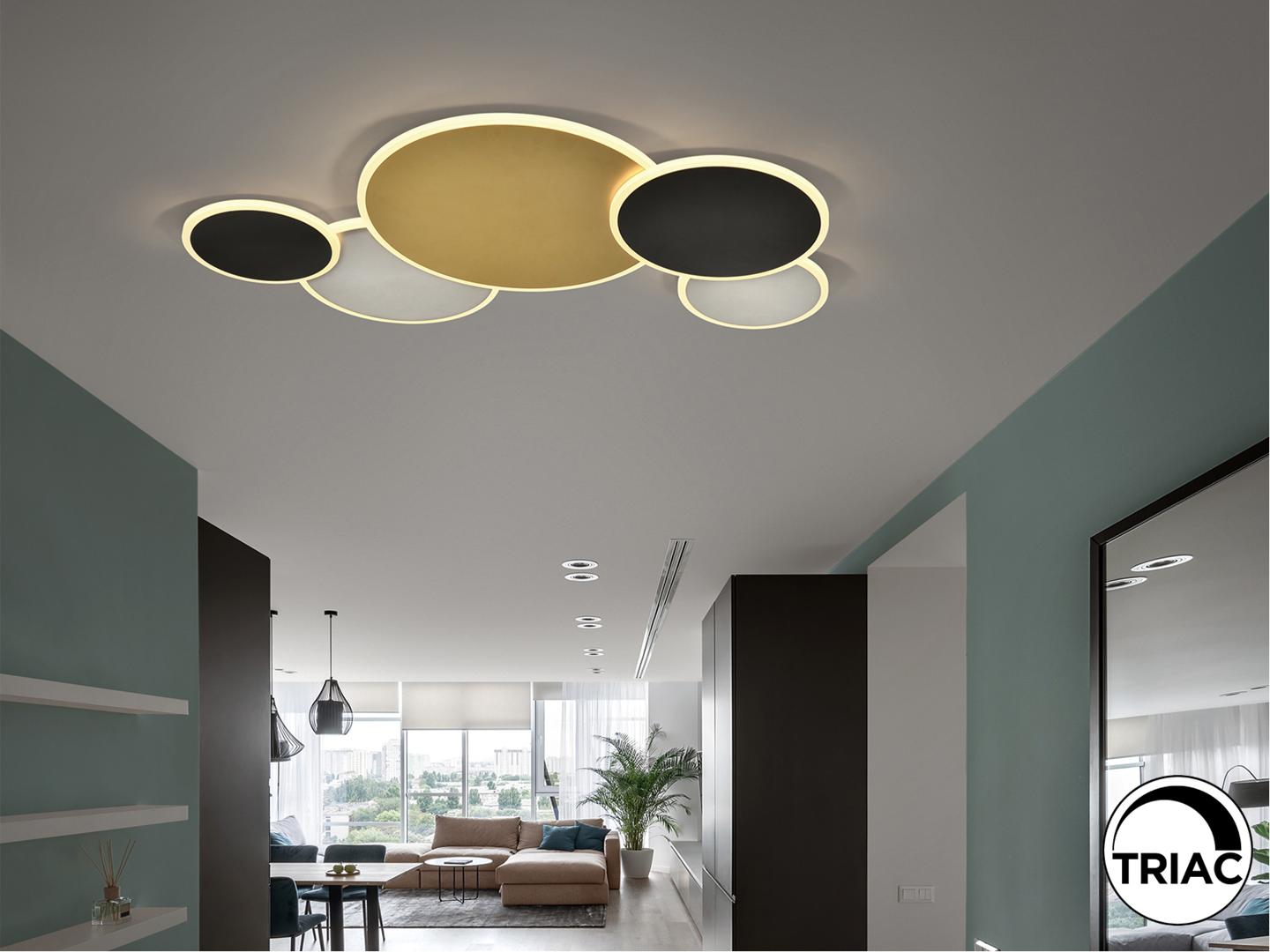 Потолочный светильник из металла и алюминия с отделкой золотистого, белого и черного матового цвета. Опаловый акриловый рассеиватель. 48 Вт, 2800 лм, 3000 К. ДИММИРУЕМАЯ. В этом продукте используется светодиодный драйвер симисторного типа и регулировка яркости 0–10 В. Его можно затемнить с помощью светодиодного настенного диммера с этими функциями. · Эта лампа поставляется с ГРАВИТАЦИОННЫМИ ПЕРЕКЛЮЧАТЕЛЯМИ для улучшения крепления к потолку.