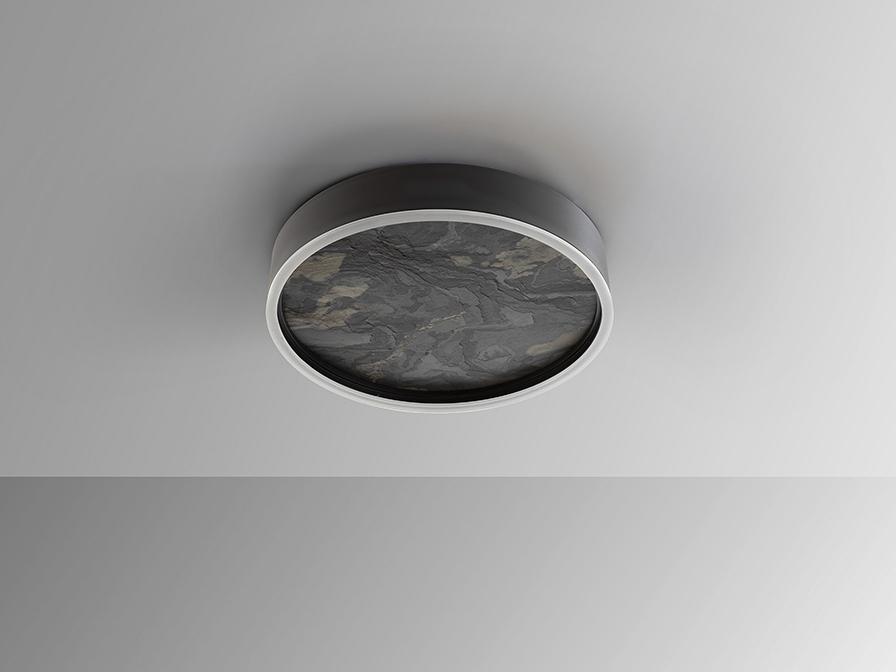 Потолочный светильник из металла, черная отделка. Рассеиватель из полупрозрачного многоцветного сланца и опаловое акриловое кольцо. Светодиодный светильник 36+20Вт, 1080 лм, смена цвета CCT, 3000/4000/6000К Выбор цветовой температуры CCT осуществляется с помощью настенного переключателя последовательными нажатиями клавиш. Функция памяти включена. · Эта лампа поставляется с ГРАВИТАЦИОННЫМИ ПЕРЕКЛЮЧАТЕЛЯМИ для улучшения крепления к потолку.