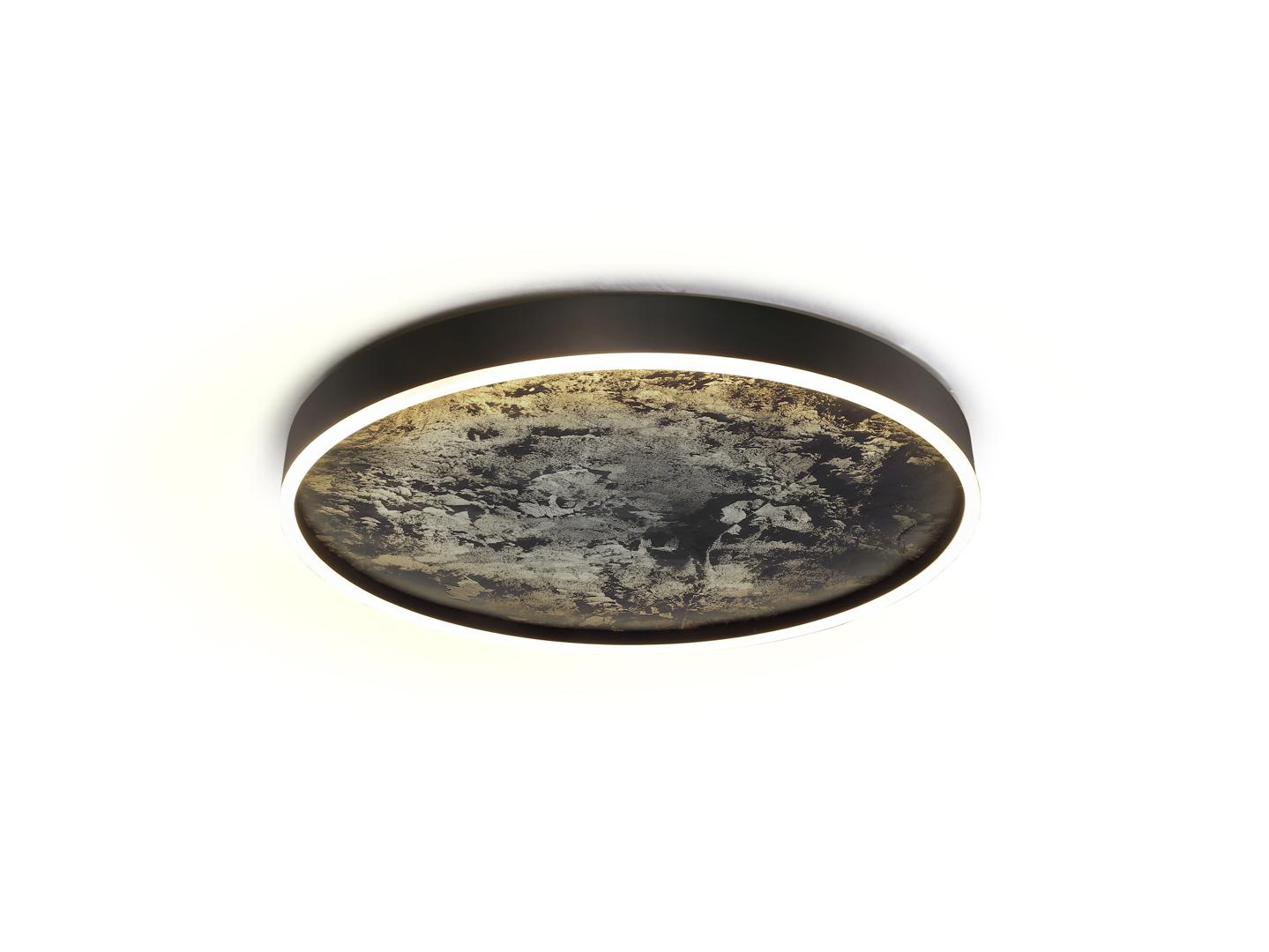 Потолочный светильник из металла, черная отделка. Рассеиватель из полупрозрачного многоцветного сланца и опаловое акриловое кольцо. Светодиодная лампа 60+35 Вт, 1354 лм, смена цвета CCT, 3000/4000/6000 К Выбор цветовой температуры CCT осуществляется с настенного переключателя последовательными нажатиями клавиш. Включена функция памяти. · Эта лампа поставляется с ГРАВИТАЦИОННЫМИ ПЕРЕКЛЮЧАТЕЛЯМИ для улучшения фиксации на потолке.