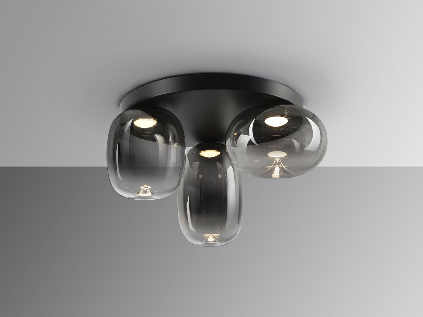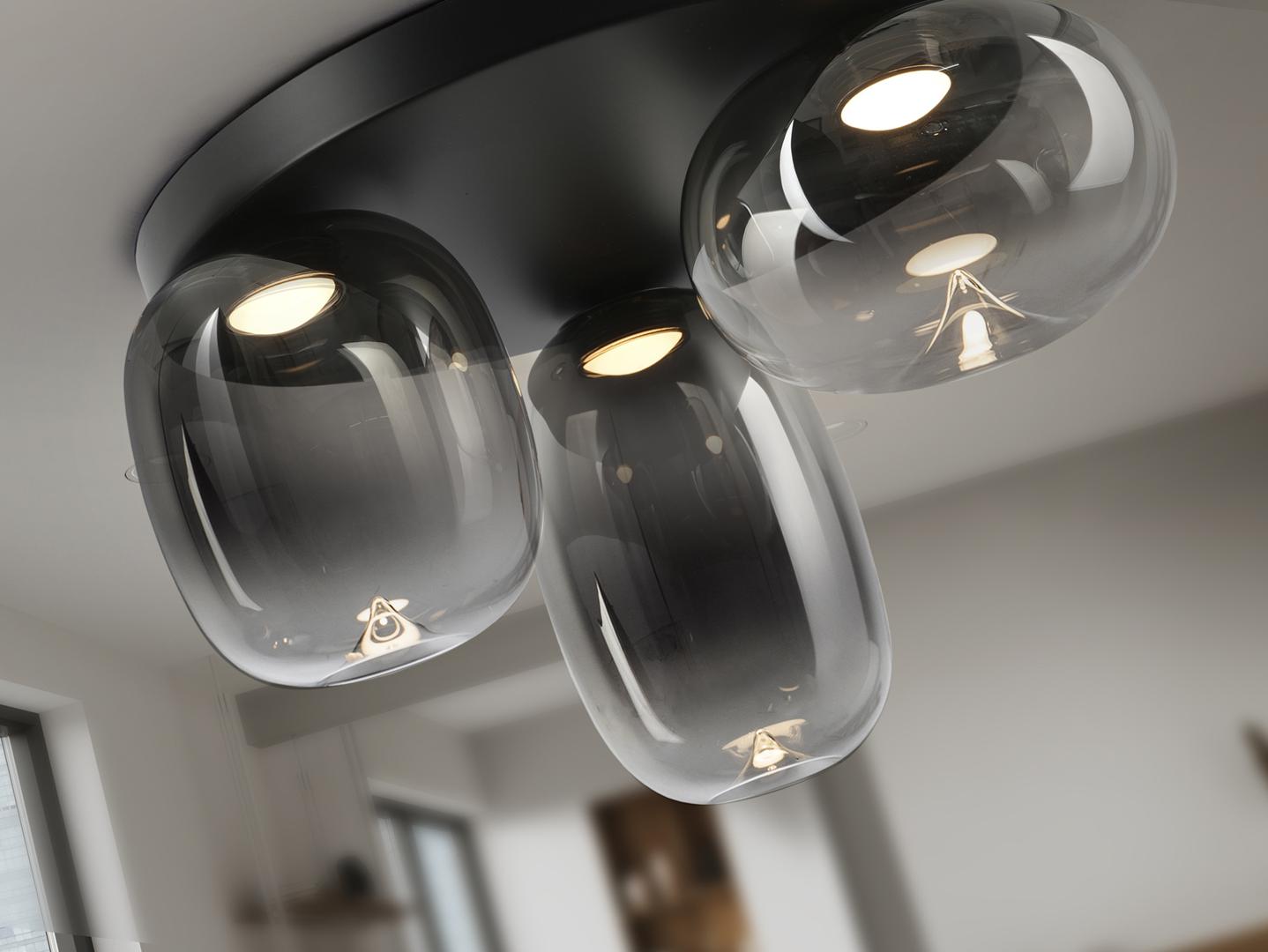 Потолочный светильник на 3 лампы из металла с матово-черной отделкой. Абажуры из дутого стекла с размытой дымчато-серой отделкой, переходящей в прозрачную. Регулируемая высота. Светодиод 18 Вт, 1000 лм, 3000 К. · Эта лампа оснащена ГРАВИТАЦИОННЫМИ ПЕРЕКЛЮЧАТЕЛЯМИ для улучшения фиксации на потолке. Доступна версия на 110 В.