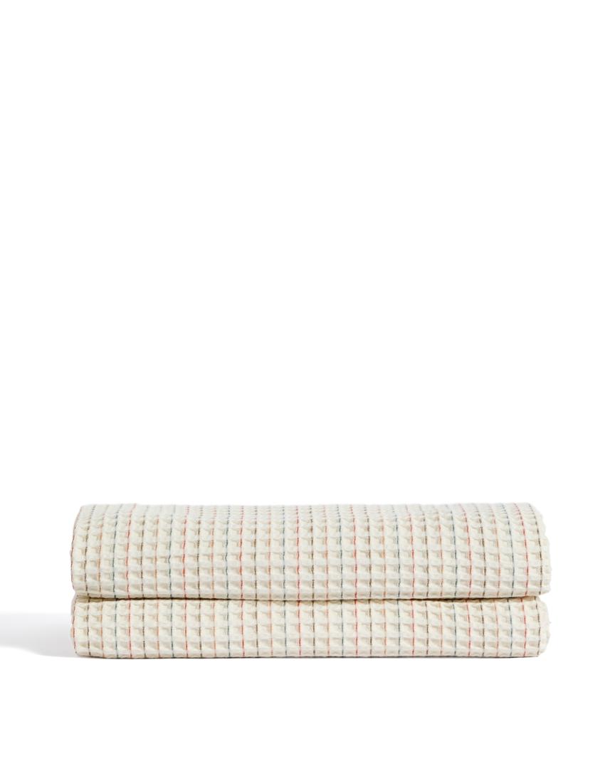 Это покрывало-трансформер для детской кроватки изготовлено из 100% хлопка, что гарантирует мягкую и приятную текстуру, идеально подходящую для ежедневного комфорта. Вафельная текстура в сочетании с разноцветными полосками привнесет свежесть и радость в любую спальню. Сделано в Португалии, стране, известной своими традициями производства высококачественного текстиля, это покрывало отличается прочностью и долговечностью, а также воздухопроницаемостью и простотой в уходе. Универсальное и функциональное изделие, идеально подходящее для обновления обстановки любой комнаты.