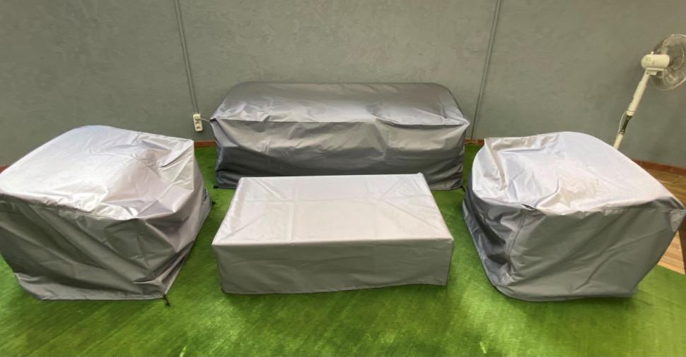 Комплект влагостойких чехлов для защиты мебели от дождя, пыли, солнца для лаунж зоны ЛЕОНОРЕН. Размеры и количество чехлов: Для трех или двухместного дивана: - 1 шт Для кресла: 81 * 78 * 69 - 2 шт Для столика: 128 * 85 * 36 - 1 шт Изготовление под заказ за 10 рабочих дней, предоплата 50%, выбор цвета ткани