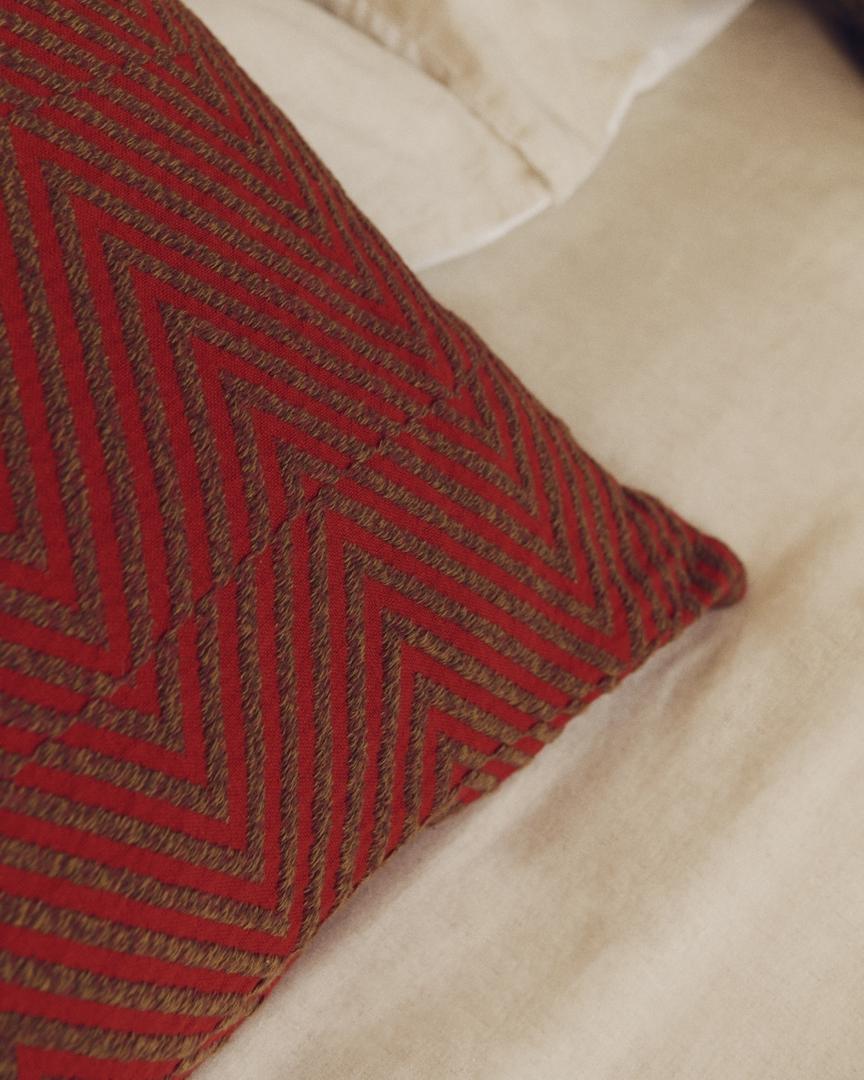Этот чехол для подушки выделяется жаккардовым узором с шевронным рисунком, который привносит текстуру и движение в любое пространство. Каждый чехол изготавливается вручную, что делает его уникальным благодаря тонким вариациям – изысканному и эксклюзивному дополнению к вашему дому. Жаккардовое плетение обеспечивает мягкость и элегантный вид, идеально подходящий для создания элегантного и элегантного образа дивана, кресла или кровати, придавая им вневременной вид.
