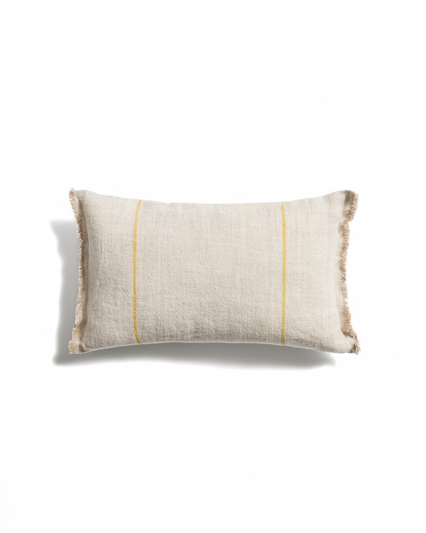 Чехол для подушки Lidore изготовлен из плотного бежевого льна, что придает ткани плотность и приятные тактильные ощущения. Дизайн отличается двумя тонкими контрастными полосами, проходящими по поверхности, и бахромой по краям, что добавляет изысканности и текстуры. Чехол изготовлен вручную, поэтому возможны небольшие вариации, обусловленные процессом производства, что делает каждый чехол уникальным.