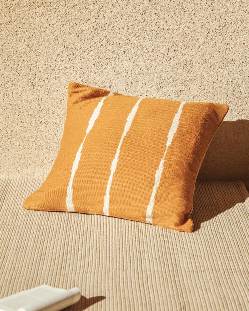 Чехол для подушки Daila изготовлен из 100% ПЭТ-волокон — прочного материала, полученного из переработанных бутылок. Эта ткань сочетает в себе прочность и мягкость, легко чистится и не требует особого ухода даже на открытом воздухе. Изготовленный вручную, он может иметь небольшие вариации, придающие ему уникальный характер. Графический узор в стиле икат добавляет текстуру и визуальную глубину, придавая неповторимый шарм любому пространству, как внутри, так и снаружи.