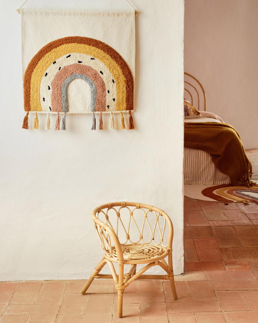Настенный гобелен Tadea от фабрики La Forma (ex Julia Grup) – яркая радуга для детской комнаты. Настенный гобелен Tadea совершенно точно очарует вашего малыша. Фактурный принт в виде радуги и игривые кисточки вдохновят малыша на новые фантазии и забавные игры. А натуральный хлопок подарит мягкость и заботу. Вы будете рады реакции малыша на обновление обстановки. Будет интересно! Гобелен имеет прямоугольную форму. Он изготовлен полностью из 100% хлопка, поэтому безопасен для здоровья ребенка. Принт набивной, с высотой ворса около 1 см. По нижнему краю надежно привязаны кисточки длиной около 8 см. Для подвеса к стене в гобелен вставлена деревянная рейка, к которой привязана веревка. Допускается ручная деликатная стирка. При сильных загрязнениях рекомендуется химчистка. Размеры: ширина – 52 см, высота – 60 см, глубина – 1 см. Вес изделия – 0,6 кг. Гобелен предназначен для эксплуатации только в помещении. В коллекции Tadea также представлены напольный коврик и чехол для подушки.
