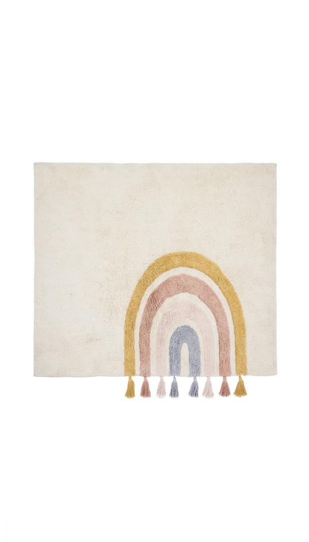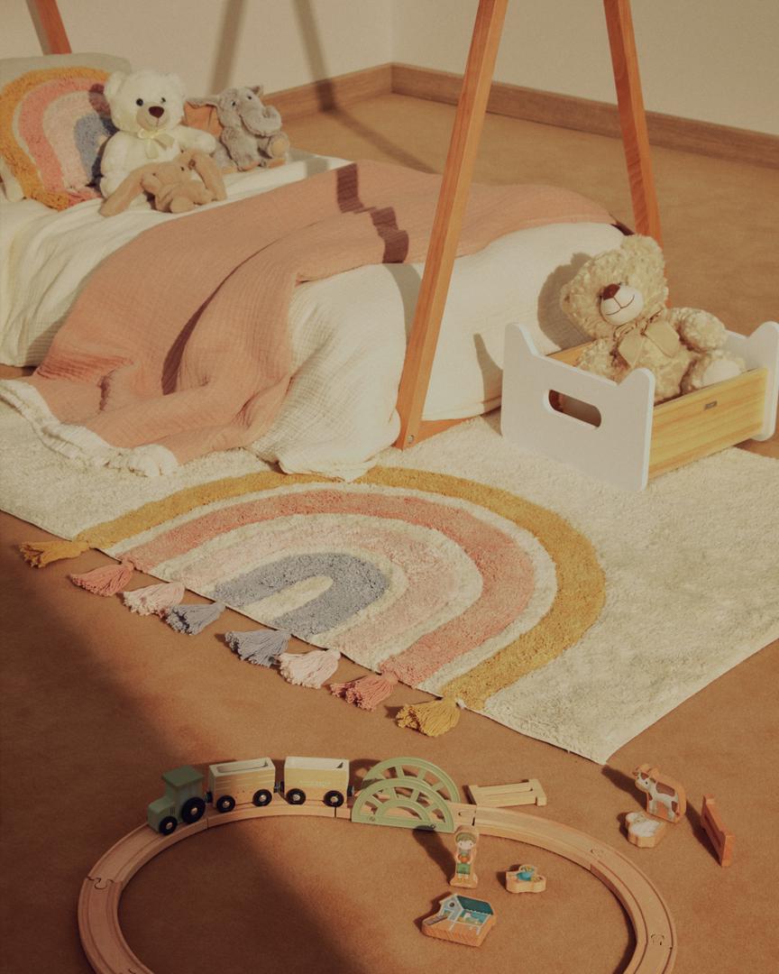 Эта коллекция полностью выполнена из хлопка, что обеспечивает ей исключительную мягкость и приятную на ощупь текстуру. Каждое изделие соткано вручную, что делает его уникальным, а небольшие вариации подчеркивают его эксклюзивность и особый характер. Дизайн украшен радужными рельефами и бахромой – декоративными деталями, которые добавят красок в любую детскую комнату. Эта коллекция, предназначенная для повседневной жизни, подходит для машинной стирки, что облегчает чистку и позволяет детям всегда наслаждаться комфортом.
