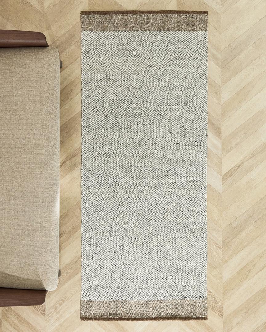 тот ковёр выделяется жаккардовым узором «ёлочка», который добавит динамичности и элегантности любому коридору. Изготовленный из тщательно подобранной шерстяной смеси, он обладает мягкой и тёплой текстурой, идеально подходящей для комфорта ног, а также изысканными бежевыми тонами, которые легко вписываются в интерьеры разных помещений. Каждый ковёр соткан вручную, что обеспечивает эксклюзивную отделку ручной работы, а небольшие вариации подчёркивают его аутентичность.