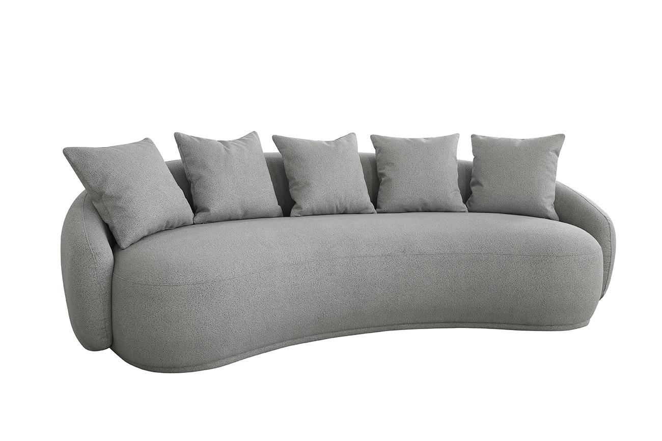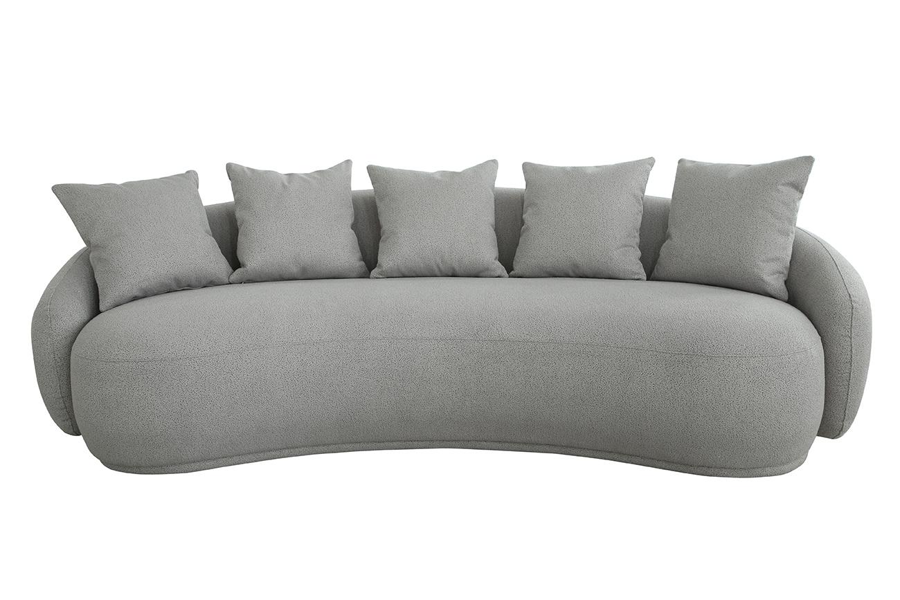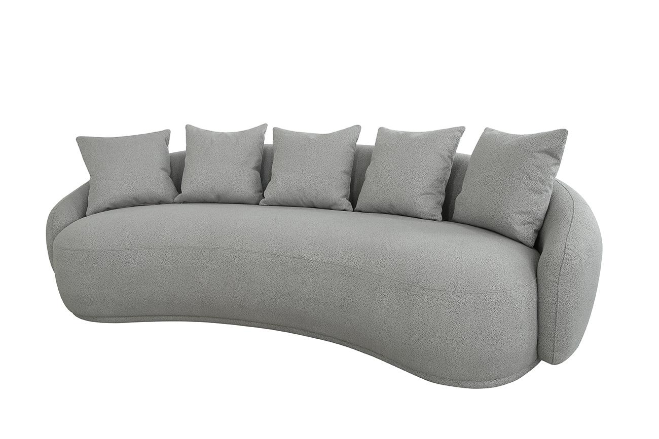 description-full - Плавные округлые линии и обтекаемые силуэты востребованы в современном дизайне. Обивка приятного серого цвета из фактурной ткани с двухцветными нитями прекрасно дополняет и делает интереснее казалось бы простую форму. Удобно расположиться для отдыха и общения помогут 5 декоративных однотонных подушек 50*50см. Габариты сиденья: ширина 212см, глубина 66см, высота от пола 42см