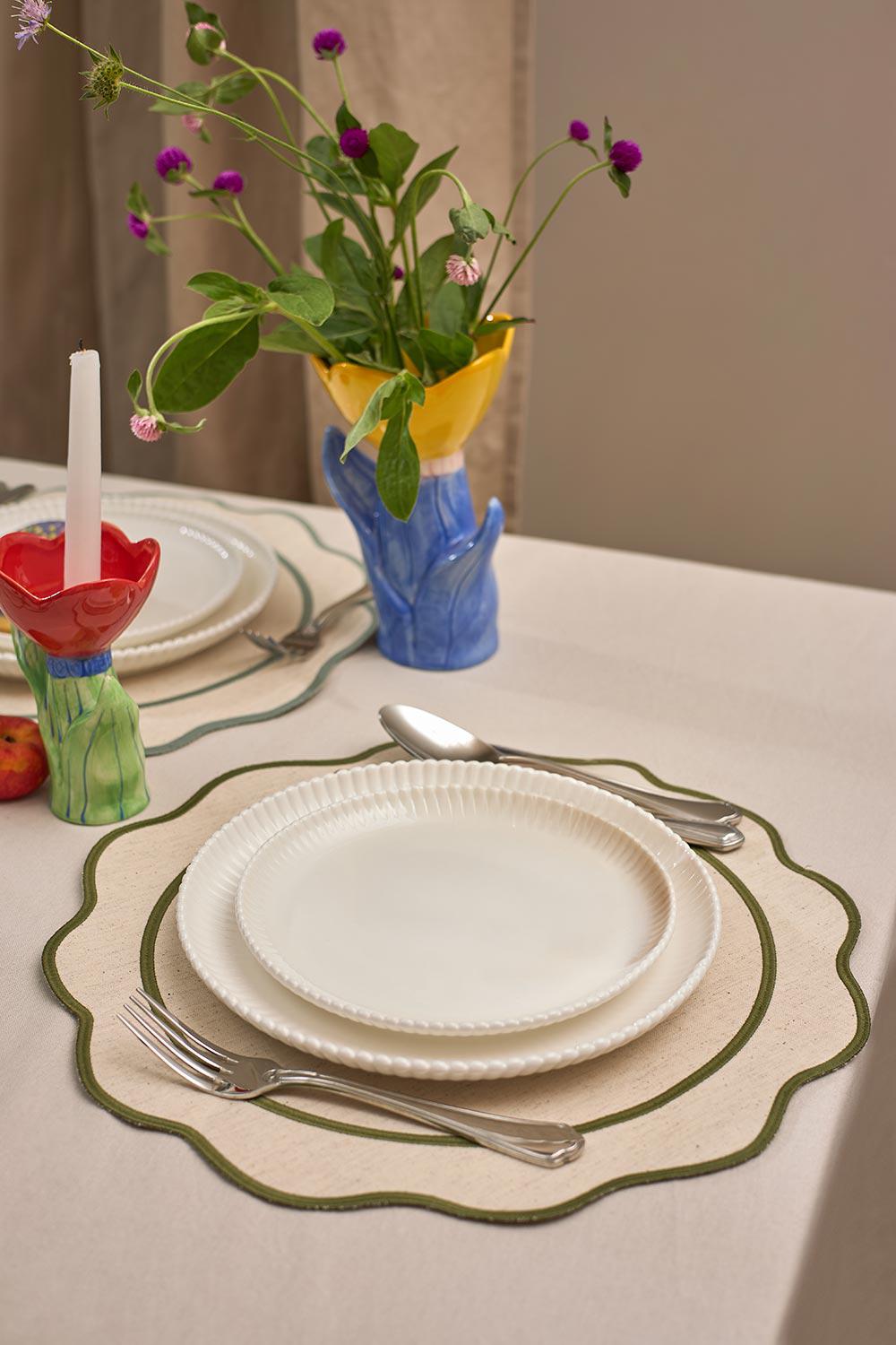 Салфетка под приборы Anemone из коллекции Trendy Ruffles с кантом оливкового цвета сделает любую сервировку стильной, позволив экспериментировать с текстурами и формами. Текстиль с волнистой отделкой, напоминающей изящные раковины морских гребешков, стал ярким элементом стиля Ар Деко – и сейчас возвращается в моду, появляясь в самых актуальных интерьерных решениях. Особенности и преимущества: - Выполнена из экологичных и долговечных материалов – смеси хлопка и льна. - Имеет трендовый дизайн, что позволяет использовать ее в качестве акцента. - Выдерживает многократные стирки, сохраняя привлекательный вид. Материалы: 90% хлопок, 10% лён. Диаметр: 38 см. ! Деликатная стирка при температуре 30° C ! Гладить при максимальной температуре 110° C ! Сушить в тени (без попадания прямых солнечных лучей) ! Не отбеливать ! Сухая чистка запрещена