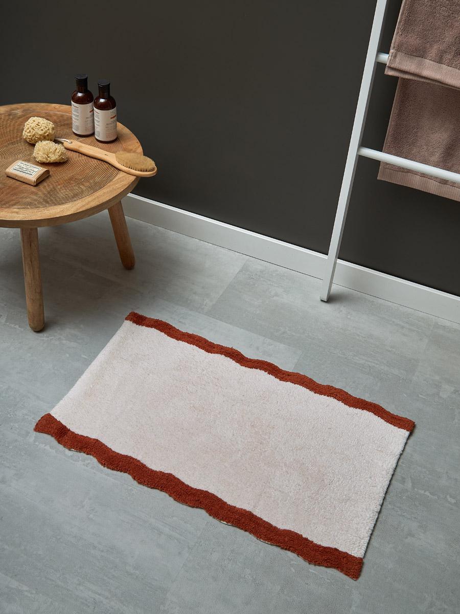 Коврик для ванной с кантом терракотового цвета из коллекции Trendy Ruffles понравится ценителям натуральных материалов и трендового дизайна. Текстиль с волнистой отделкой, напоминающей изящные раковины морских гребешков, стал ярким элементом стиля Ар Деко – и сейчас возвращается в моду, появляясь в самых актуальных интерьерных решениях. Особенности и преимущества: - Прочный и долговечный 100% хлопок хорошо впитывает влагу и быстро сохнет. - Трендовый дизайн позволяет использовать коврик в качестве стильного акцента. - Данная линейка представлена в разных цветовых решениях, что позволяет выбрать наиболее подходящий вариант, в зависимости от оформления интерьера и личных предпочтений. Материал: 100% хлопок. Размеры: 50х80 см. ! Деликатная стирка при максимальной температуре 30° C ! ! Гладить запрещено ! Возможна барабанная сушка при низкой температуре ! Не отбеливать ! Сухая чистка запрещена
