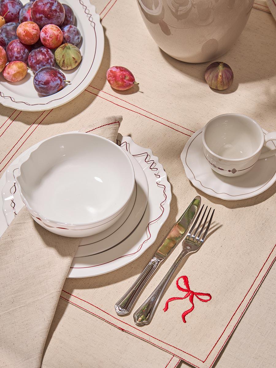 Салфетка под приборы Fancy Bows из коллекции Essential – не просто элемент сервировки, а часть атмосферы. Ее мягкий оттенок и лаконичный дизайн с легкими декоративными акцентами создают ощущение уюта и продуманной гармонии. Такая салфетка не отвлекает, а тонко демонстрирует внимание к деталям. Особенности и преимущества: - Комбинация хлопка и льна делает ткань приятной на ощупь, устойчивой к износу и простой в уходе. - Спокойный бежевый оттенок легко сочетается с любой посудой и текстилем, позволяя экспериментировать с цветом. - Акцент в виде бантиков придает дизайну легкость и игривость, но не перегружает его. Состав: 90% хлопок, 10% лен. Плотность: 370 г/м2. Размеры: 35х45 см. ! Деликатная стирка при температуре 30° C ! Сушить в тени ! Гладить при максимальной температуре 150° C ! Барабанная сушка запрещена ! Не отбеливать ! Сухая чистка запрещена