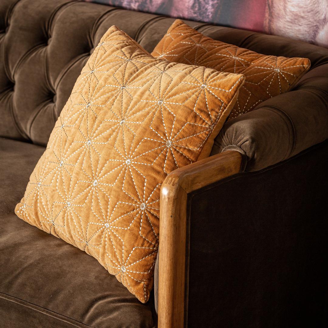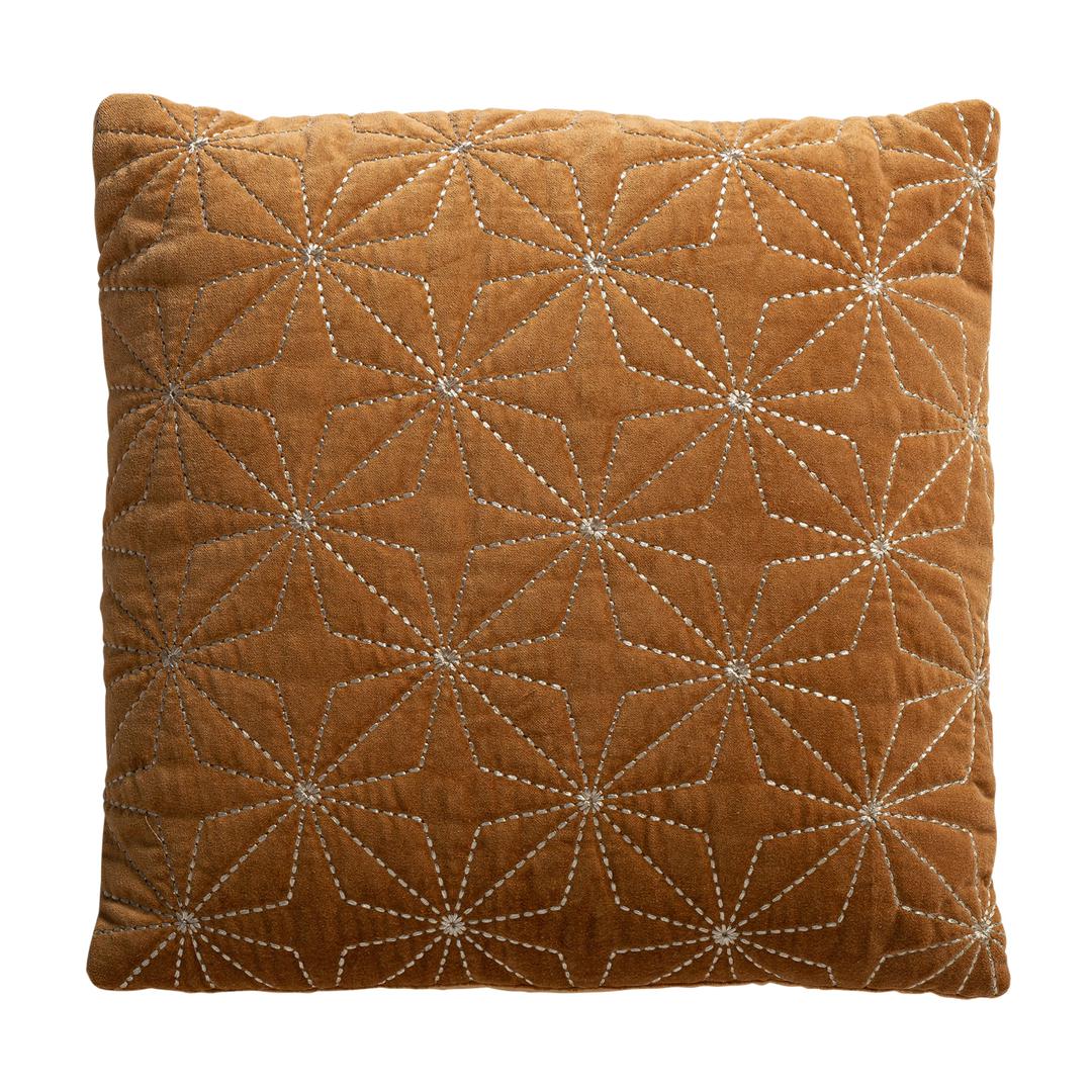 Подушка Vilma, вышитого цвета охры, в классическом стиле. Изготовлен из бархата в сочетании с хлопком и полиэстером. Съемный продукт.