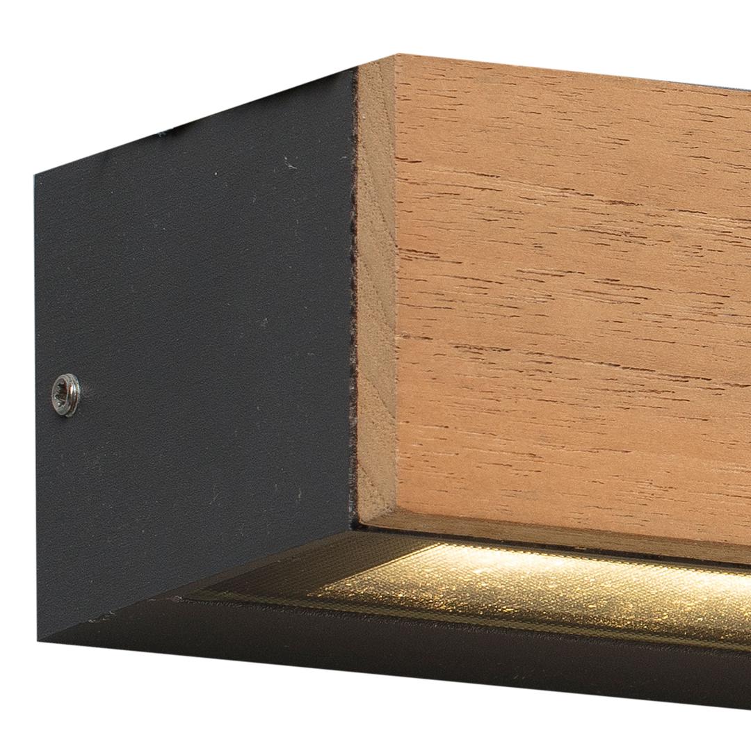 LAKO — настенный светильник для наружного освещения, изготовленный из литого под давлением алюминия со стеклянным рассеивателем. Этот настенный светильник с отделкой под дерево со светодиодной защитой имеет степень защиты IP65, что обеспечивает высокую степень защиты от дождя и твердых частиц. Свет проецируется под углом 90° только в одну сторону.