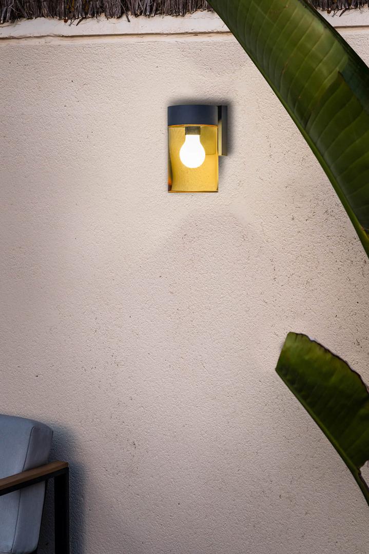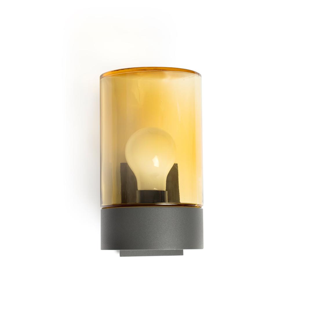 KILA — это коллекция наружного освещения из алюминия и стекла. Его дизайн идеально отделяет серую структуру полупрозрачного рассеивателя, позволяет видеть лампочку. Этот темно-янтарно-серый настенный светильник идеально подходит для входов, веранд и террас.